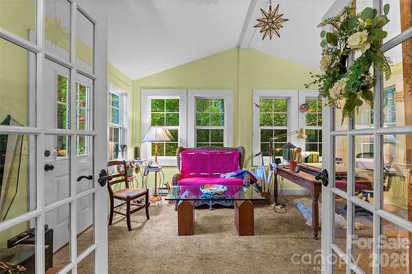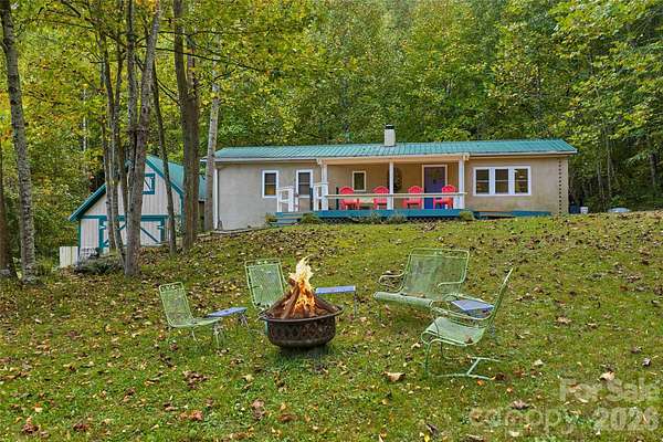Create your own private mountain retreat in Western NC, surrounded by over 600 acres of protected land owned by the Southern Appalachian Highlands Conservancy-ensuring lasting privacy, peaceful surroundings, and preserved views for generations to come. Set at 3,000 feet elevation at the end of North Turkey Creek Rd, this 2 bed, 2 bath home sits on 10.12 wooded acres with meandering trails, spring-fed streams, and multiple potential homesites-ideal for a guest cottage, family compound, or short-term rental cabins. Originally built as a "Y2K bunker," the concrete construction offers exceptional durability and natural insulation, complemented by solar panels and a 1,500-gallon holding tank previously connected to a spring. Inside, the main level features two bedrooms and a full bath, with one bedroom doubling as a light-filled sunroom with French doors. The open living and kitchen area is anchored by a cozy woodstove. The finished lower level (approx. 739 sq ft) includes a full bath and private exterior entrance, offering flexible space for a guest suite, studio, or home office (not included in main HLA due to separate access). Unique details throughout include a built-in reading nook, river stone flooring accents, a hand-painted ceiling, and a beautifully tiled hearth wall. A 590 sq ft outbuilding with loft adds even more versatility-perfect as a workshop, studio, garage, or potential additional living space. Recent updates include fresh paint and reinforcement on the partially covered deck, fresh interior paint, and improved exterior drainage. Whether you're seeking a quiet, self-sufficient lifestyle, exploring permaculture, or envisioning a wellness retreat, this property offers a rare opportunity to create something truly special. AWD is HIGHLY recommended. 35 minutes to Asheville | 30 minutes to Marshall | 50 minutes to Hot Springs