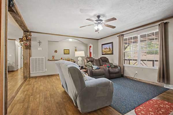 Est $2,760/moOPEN HOUSE 2-4, Sunday! With just over 14 acres, this cozy and comfy 3 bedroom, 2 bathroom home, is one to check out. Primary bathroom has a huge walk in shower, tons of kitchen cabinet space and extra large island with SS appliances. Exterior features a full length covered front porch, a huge rear covered deck, multiple sheds and a shop space. A deer stand, and several trails on property and several smaller cleared areas. Two smaller tracts, included in the 14 acres, are across Highway 7(Survey in pictures). Saw mill setup is also negotiable.