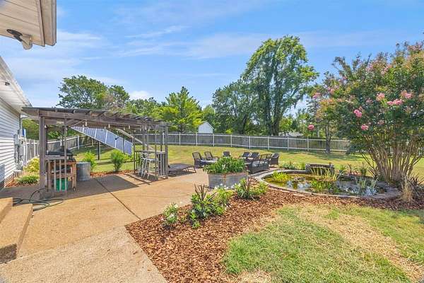 - Backyard Fence, Covered Front Porch, Fence, Garden Area, Landscaping, Log, Mature Trees, Pond(s), Rail, Trees, Wood