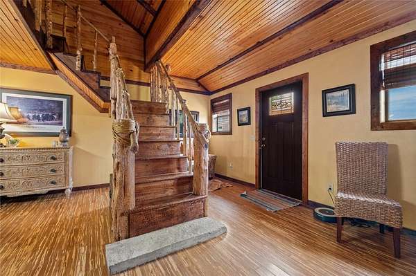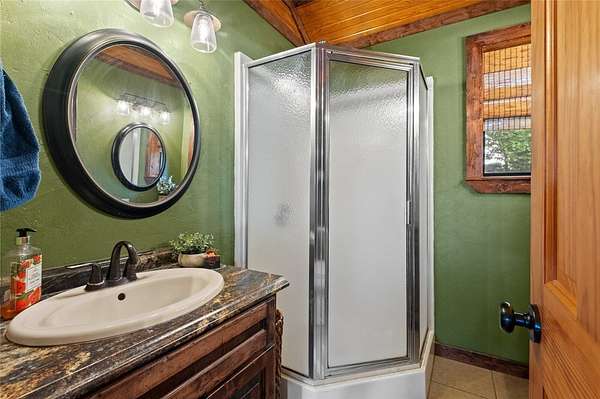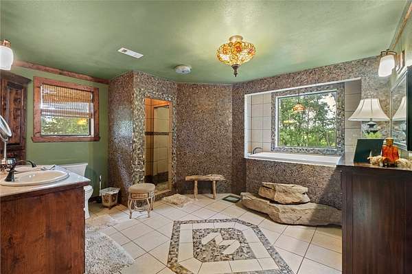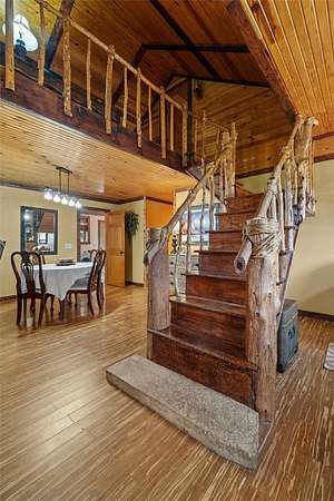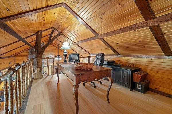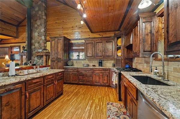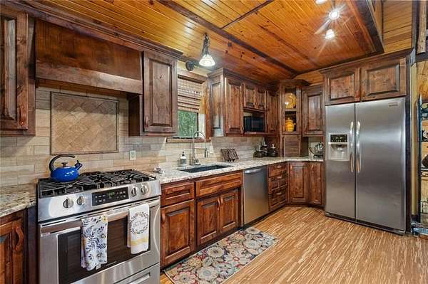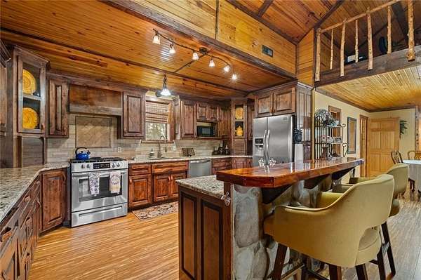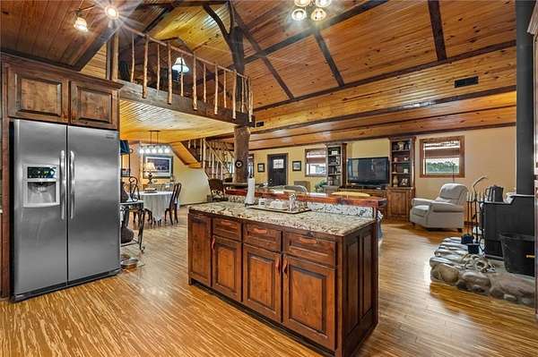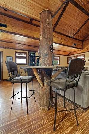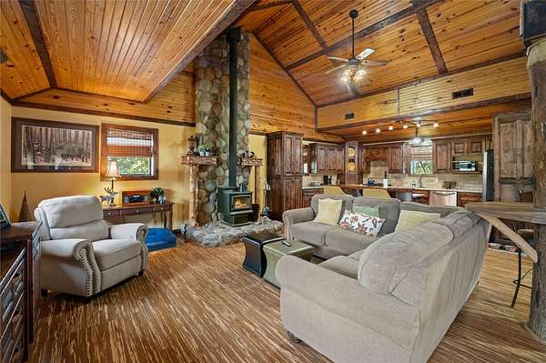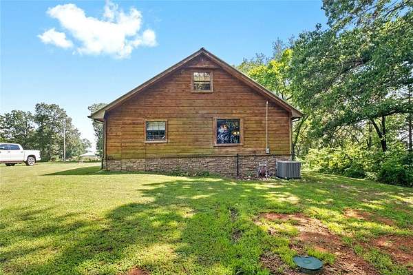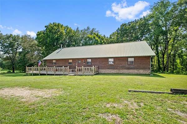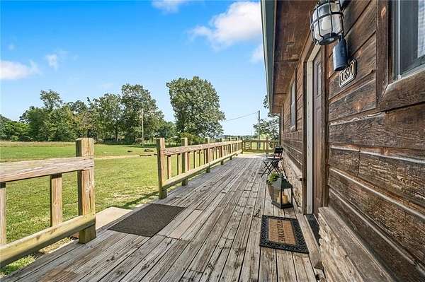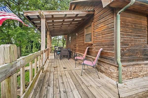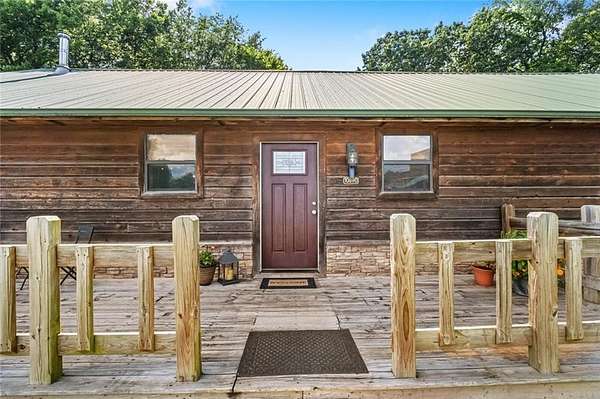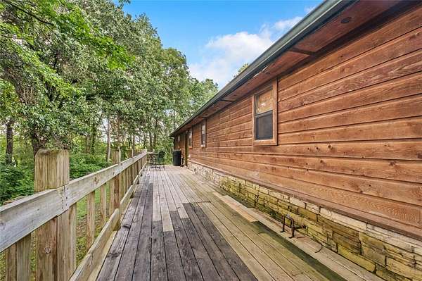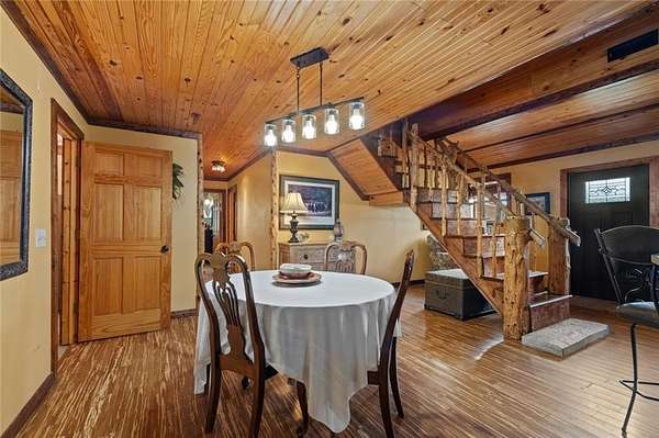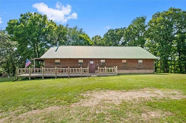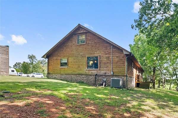 Beautiful cabin living on 5 acres +/- in country setting not far from town! This home features a rustic charm starting when you walk through the door! Chef's kitchen with dark stained wood cabinets, granite countertops, island with step up bar seating, open concept to the living room that features stone hearth that extends to ceiling behind the freestanding wood stove. Cathedral ceilings in living room opening into the loft area (currently used as home office space) that looks over living & kitchen. Upstairs features bedroom #3 closed off from loft area. Downstairs includes main and 2nd bedrooms along with en-suite main bathroom with custom features of built-in soaking tub, walk-in shower with rock surround, and large walk-in closet. Detached 30x60 shop includes two garage doors, insulated walls w/osb, and plenty of space for projects or storage! New well pump. 6 minute drive to downtown Pea Ridge.