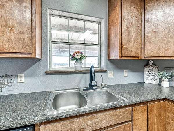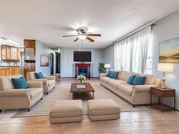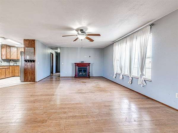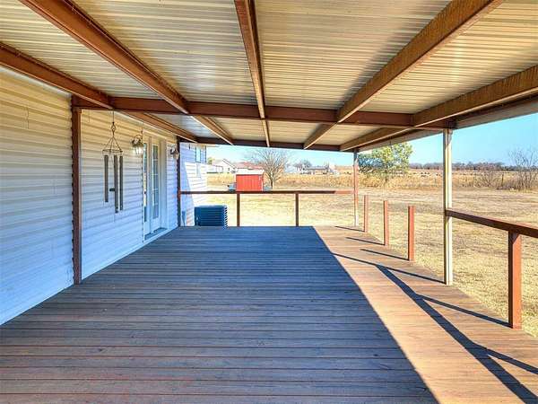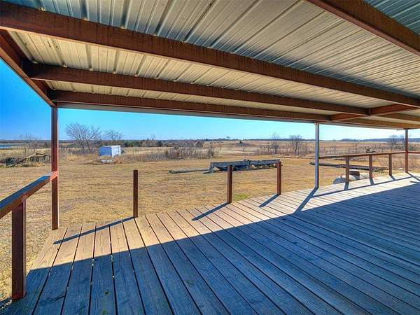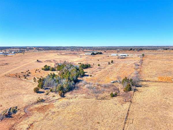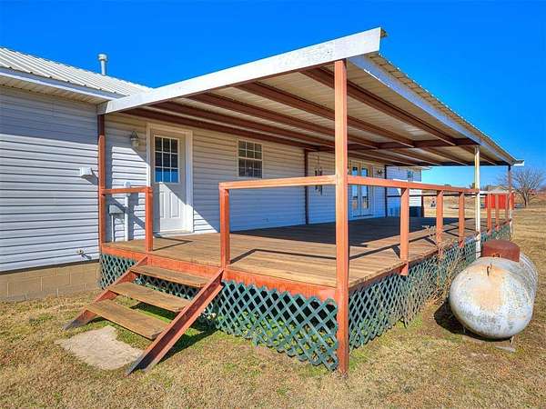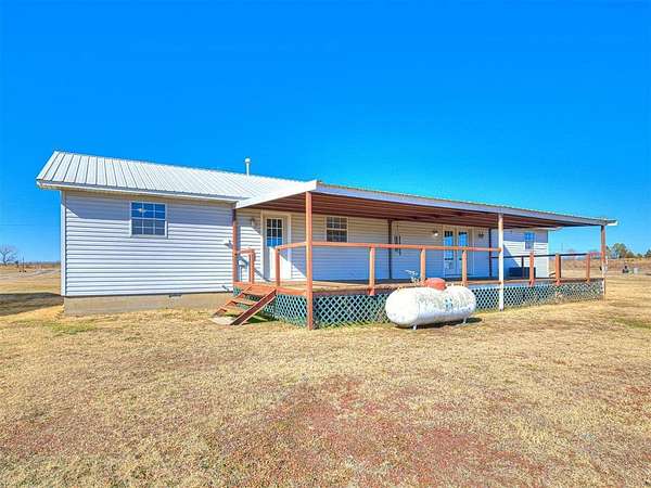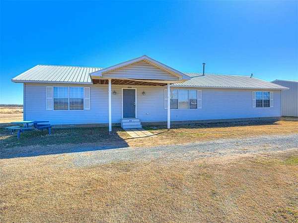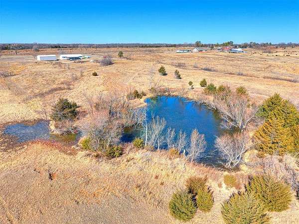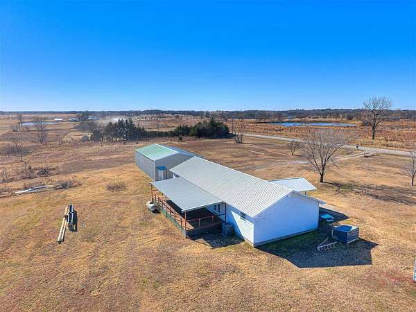 Surrounded by beautiful farmland, you will find this Charming house on 10 acres with pond, shop, in Prague Schools! Built in 2008, this 4 bedroom 2 bath home offers 1848 sq ft of comfortable living with bamboo flooring and a functional open layout. The kitchen features stainless steel appliances, gas stovetop, ample storage, a good size dining area, and flows easily into the spacious living room, which includes a gas fireplace. Primary Suite features a remodeled Bathroom with soaking tub and shower. Laundry room and second bedroom on same end of the home as Primary bedroom and bathroom. On the other end of the home you will find a second bathroom with shower/tub and 2 additional bedrooms. The home is all electric with the exception of gas cooktop and fireplace and includes a whole-house Culligan water softner. Enjoy peaceful county living from the spacious 40X15 covered back deck, complete with metal joists and sweeping views of the property and pond. 30X50 shop with two overhead doors and a chicken coop with power, perfect for hobby farming or livestock. Additional features include a metal roof, septic system, leased propane, private well (or rural water available if preferred), and service through Canadian Valley Electric with fiber internet. Located in Prague Schools in Pottawatomie County, beautiful farmland views, rural charm, short commute to town.
