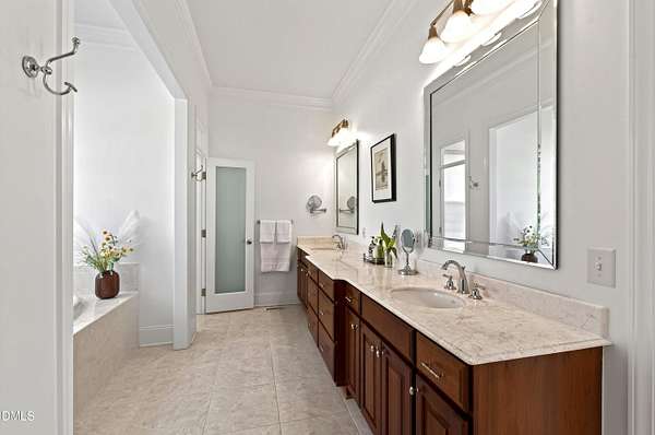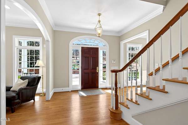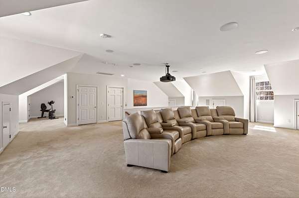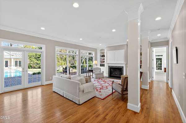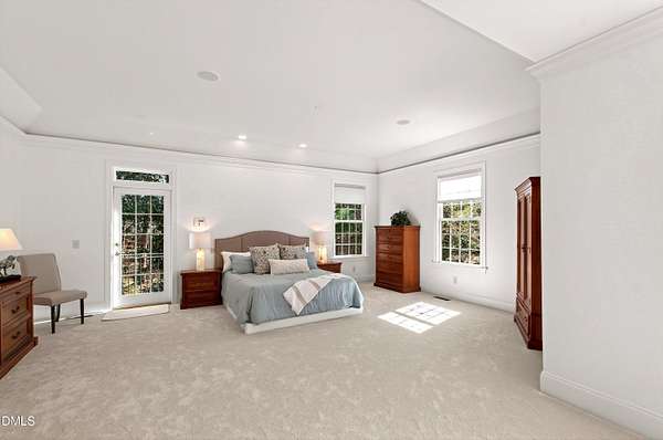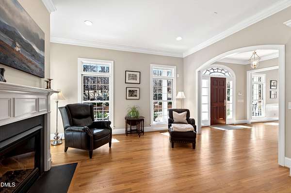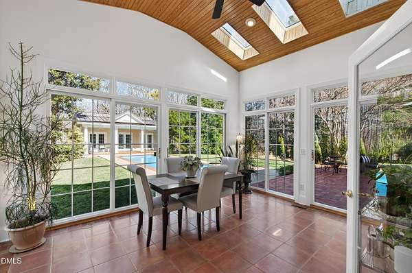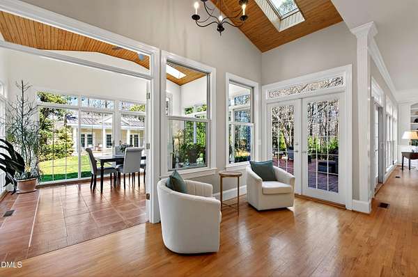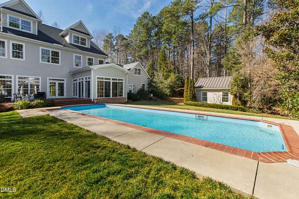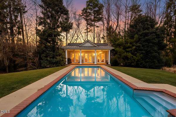 Privately positioned on over 1.6 acres within Chapel Hill's highly regarded The Reserve, and quietly tucked at the end of a peaceful cul-de-sac, this show stopping distinguished custom residence offers nearly 7,700 square feet of beautifully considered living across three refined levels, providing both privacy and a true sense of retreat and incredible curb appeal. Designed by its owners with exceptional attention to proportion, flow, and architectural detail, the home balances quiet grandeur with warmth and livability. Expansive windows invite natural light throughout, framing serene woodland views and creating a seamless dialogue between interior elegance and the surrounding landscape. The setting feels tranquil and removed, yet remains moments from the very best of Chapel Hill. The principal suite is thoughtfully situated on the main level, allowing for sophisticated first-floor living. Formal entertaining rooms are gracefully composed, while a richly appointed library offers a more intimate retreat. Every space has been curated to feel elevated, welcoming, and entirely at ease. An exceptional collection of lifestyle amenities further distinguishes the residence, including a private cinema, games room, creative studio, executive offices, whole house generator and elevator access to all floors, ensuring both everyday convenience and long-term livability. Outdoors, the estate transforms into a private resort. A stunning pool and accompanying pool house create a sanctuary reminiscent of a boutique retreat, where summer afternoons unfold effortlessly and evenings are designed for gathering beneath the Carolina sky. The cul-de-sac location enhances the sense of calm, offering a quiet and peaceful environment rarely found at this scale. Beyond the main residence, a charming guest house and separate temperature-controlled studio provide remarkable flexibility for extended family, visitors, or independent work arrangements. Immaculately presented and complete with a three-car garage, this residence exudes quiet confidence. It offers scale, privacy, resort-caliber amenities, and enduring quality in one of Chapel Hill's most established and desirable communities.