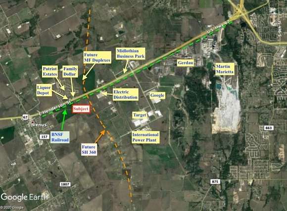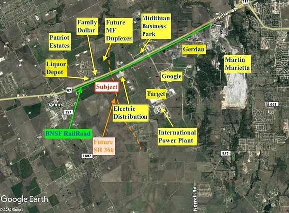 Est $29,257/moThis 54.533 acres is located in predominately growing area of Ellis County. Future Potential State Highway 360 will be on the east side of the property, near Google Data Center, Railport, Midlothian Business Park, Gerdau, Martin Marietta and International Energy plant. Future zoning being Industrial Zoning from the City of Venus.