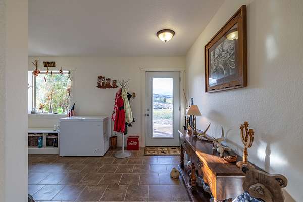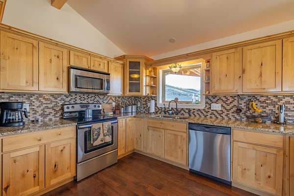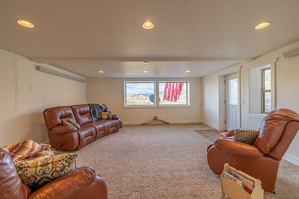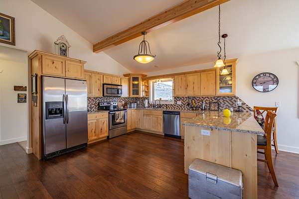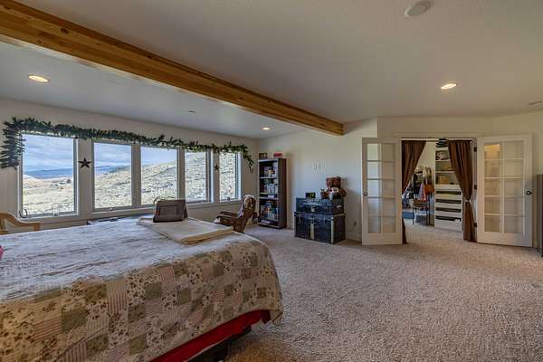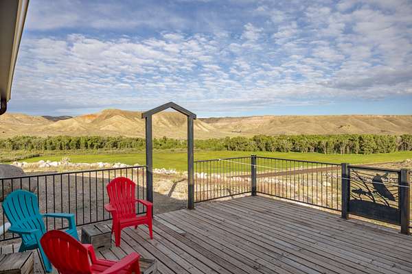 Inside the home features a spacious master ensuite with a walk-in closet, a dedicated workout area, and custom knotty pine kitchen cabinets. The open-concept layout is perfect for entertaining or relaxing while soaking in the incredible surroundings. Boasting 3,664 sq. ft. of well-designed living space, this home offers panoramic views of the East Fork River and the majestic Absaroka Mountains through expansive windows that fill the home with natural light.