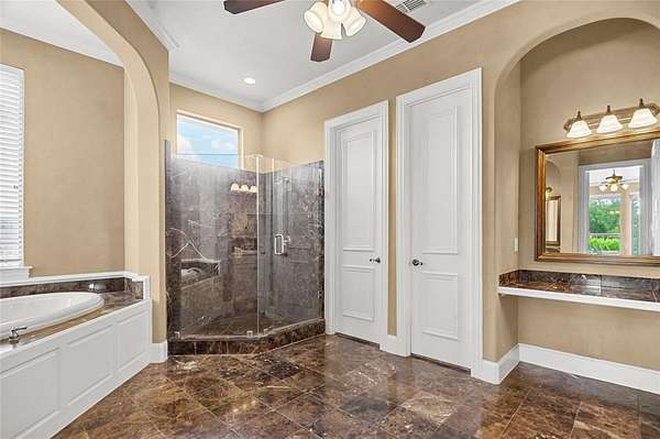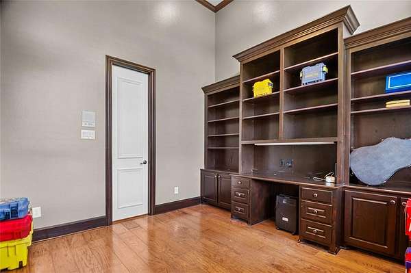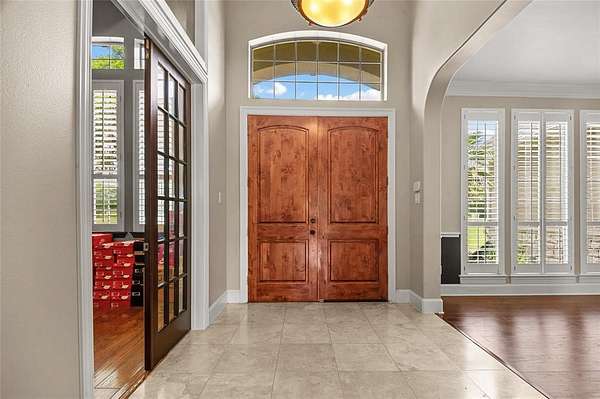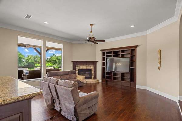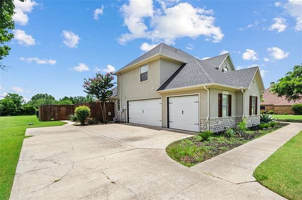 Discover this stunning custom home located in the highly sought-after Austin Corners community of Rockwall. Nestled on approximately 1.5 acres along a private greenbelt, this exceptional 4 bedroom, 3.5 bath residence offers an open-concept floor plan highlighted by a grand double wood door entry, rich wood floors, plantation shutters, and a striking stone fireplace. The gourmet kitchen is equipped with updated stainless steel appliances, a state-of-the-art 5-burner gas cooktop, and a spacious walk-in pantry. The luxurious primary suite features a cozy sitting area with its own fireplace and serene views of the beautifully landscaped backyard oasis. Additional features include a private study with built-ins, as well as an open media and game room perfect for family entertainment. Step outside to the expansive covered patio, complete with a sparkling pool and hot tub, all overlooking the tranquil greenbelt--ideal for hosting friends and family. This hidden gem is a rare find and won't last long!