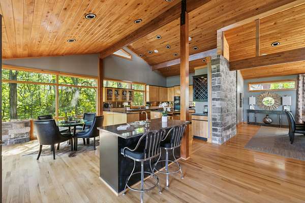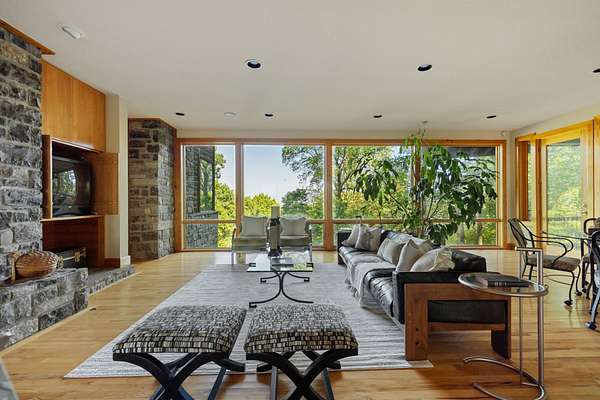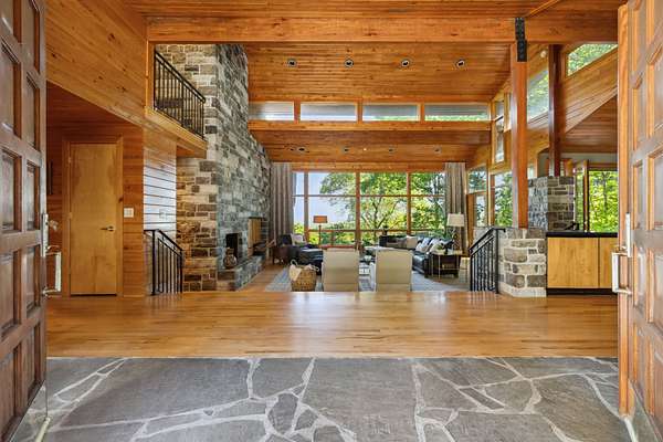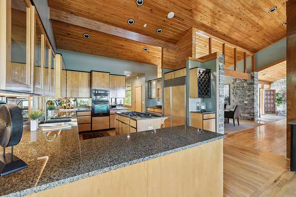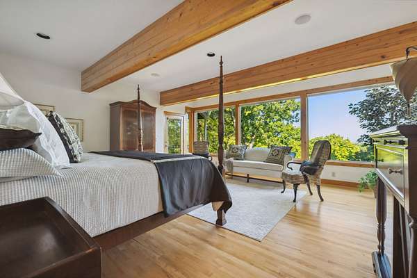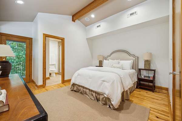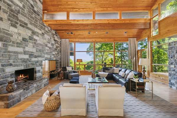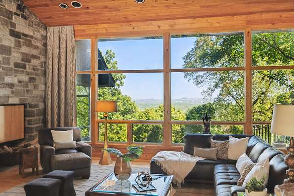 The main level showcases soaring ceilings, a striking stone fireplace, and an effortless flow between living spaces. Wake up in the owner's suite to breathtaking skyline views, complemented by a cozy wood burning fireplace, a private deck, and two bathrooms.