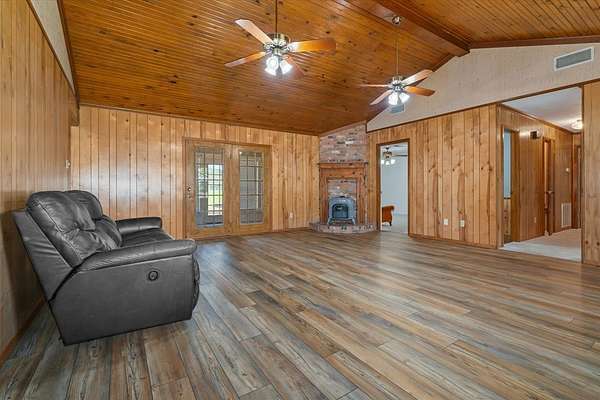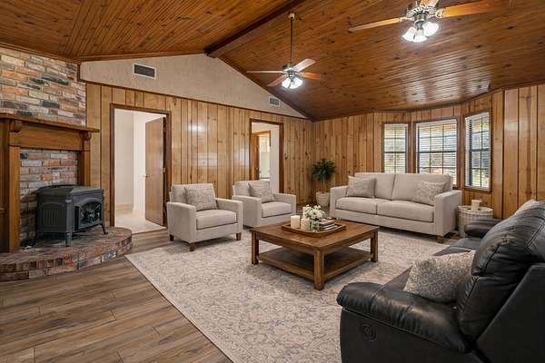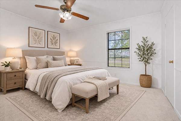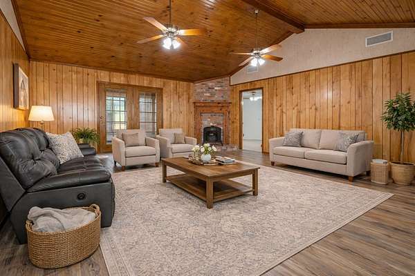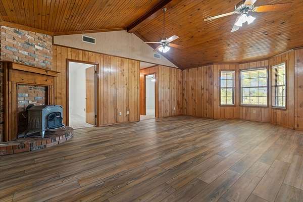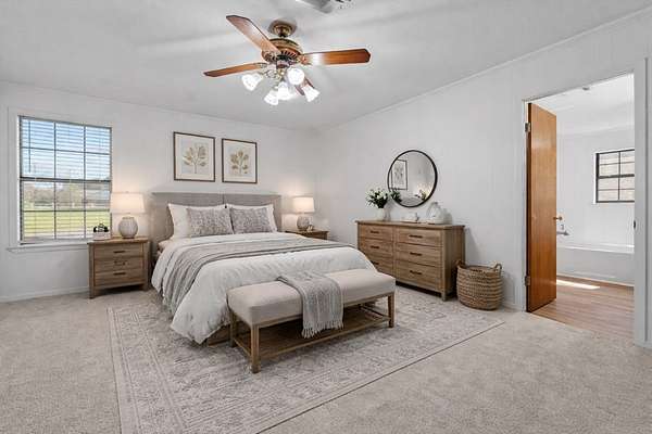 MEADOWOOD BEAUTY! This beautiful home is located just outside the city limits of Crockett, TX, offering 3 bedrooms, 2.5 bathrooms, and 1,895 square feet of living space on 2.0 acres just within the Meadowood Subdivision. The lawn has established trees and attractive landscaping around the home. The home has an attached two car, covered carport with utility room. A backyard deck is visible and accessible from the sunroom where you can enjoy your morning coffee and the sunrise. A new roof has been added as well as new flooring in the living area and bedrooms. This home features two of the three bedrooms having private bathrooms and walk-in closets. The primary bathroom has been renovated. There is a wood burning fireplace in the living area. The living area and dining area are spacious, providing room for family gatherings and entertaining. If you are looking for a home with a country feel but close to amenities, then this home is for you! Call us today for a private showing.