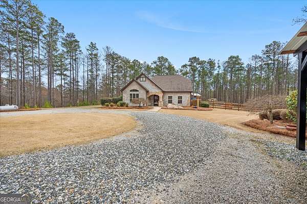 Welcome to a rare 6.72 acre private estate where luxury meets serenity. This home is an absolute dream and a true private oasis designed for both luxury and relaxation. Set beautifully off the road, this one of a kind property offers a peaceful wooded backdrop and an impressive circular drive that creates a grand first impression while providing abundant parking and effortless flow. A stunning blend of rock and flagstone sidewalks and entryways lead you to a beautifully crafted front door with wrought iron detailing. Inside, the two story living room makes an immediate statement with soaring ceilings, an open staircase view, and a dramatic rock fireplace that serves as the heart of the home. Natural light pours in, highlighting the seamless open concept design connecting the living room, dining area, and kitchen. The kitchen is both elegant and functional, featuring granite countertops, an oversized island, bar seating, a gas stove, and a custom wood vent hood that adds warmth and character. There is ample space for gathering, entertaining, and everyday living. The owner's suite offers a warm and modern retreat. The en suite bath showcases double raised vanities, shiplap accents, designer tile, and a frameless glass shower finished in classic subway tile. Every detail has been thoughtfully updated with stunning modern finishes throughout the home. Upstairs, a loft overlooks the main living space, creating architectural interest and added flexibility. Two spacious bedrooms provide comfortable accommodations, and one features a crafted wood accent wall that adds character and charm. They share a beautifully designed full bath with a statement sink, gold accents, and exquisite tile work. A large bonus room with a single custom barn door provides endless possibilities. With its own separate side entry, this space could serve as a playroom, office, private living area, or multi generational suite. Step outside to experience the full beauty of this private resort. The Gunite saltwater pool with a dramatic waterfall creates your very own grotto. A tanning shelf offers the perfect place to relax in the sun, while flagstone surrounds the pool area for a timeless and upscale finish. The covered outdoor living room features a full rock fireplace with a rounded hearth and beautiful mantle, alongside a fully equipped outdoor kitchen designed for entertaining. A separate outdoor fire pit adds yet another gathering space for evenings under the stars. The entertainment area is privately fenced, with an additional fenced section providing generous space for pets while keeping them separate from the pool and gathering areas. This estate also includes a charming chicken coop and a two story storage building ideal for outdoor equipment, tools, farm toys, or recreational vehicles. Completely updated with stunning modern finishes and surrounded by peaceful wooded acreage, this extraordinary property offers luxury, privacy, and endless lifestyle possibilities. This home is truly one of a kind.