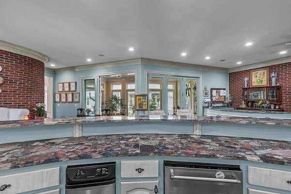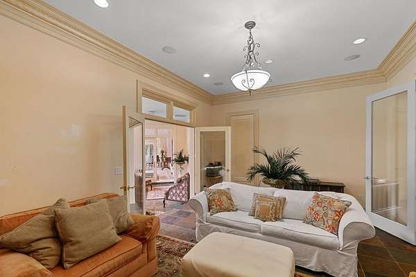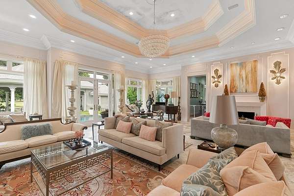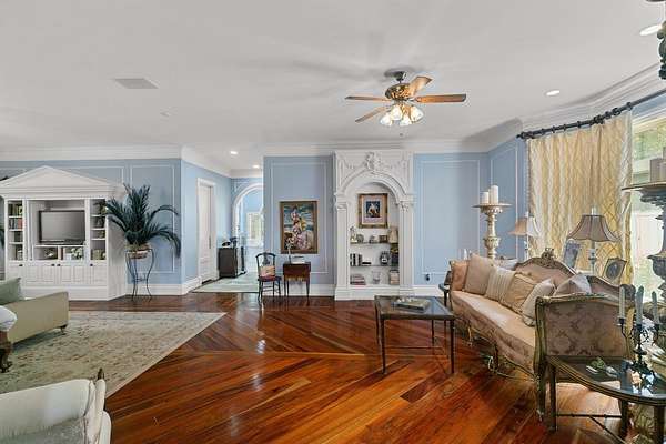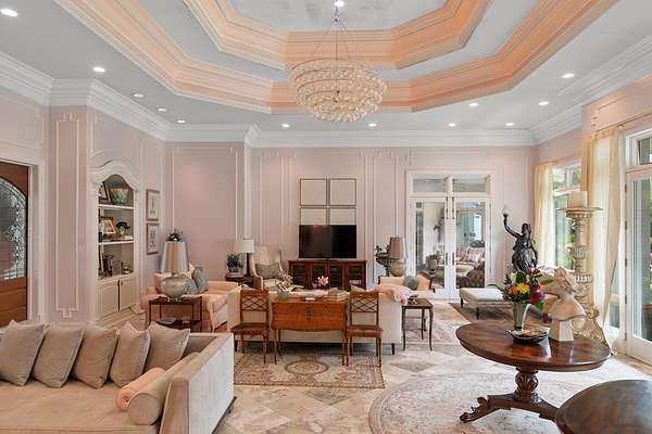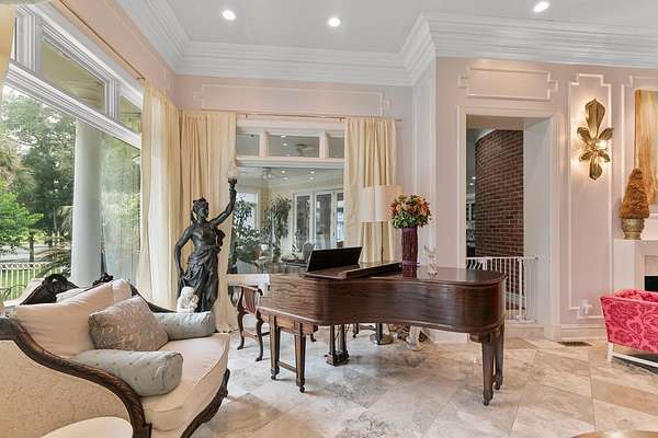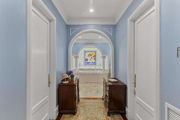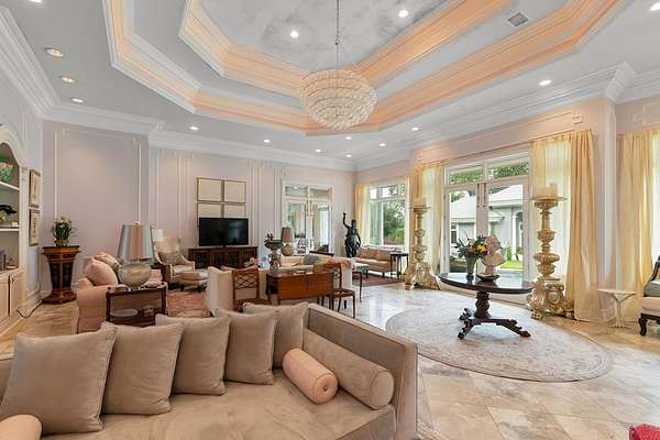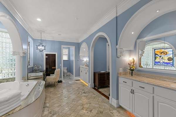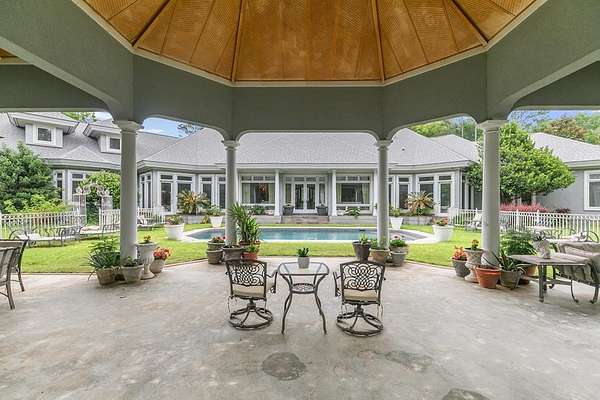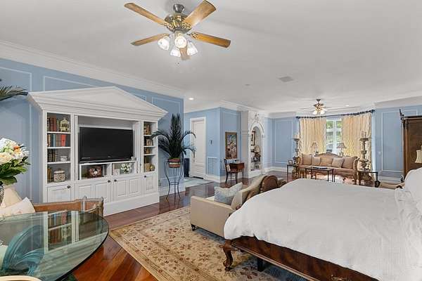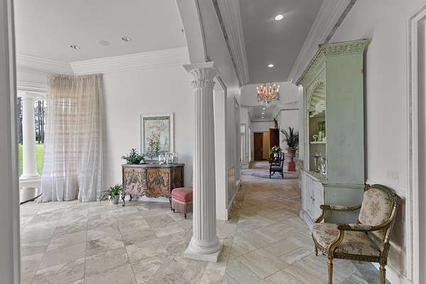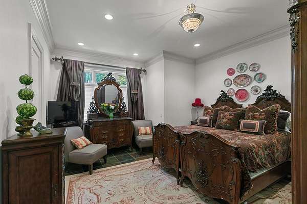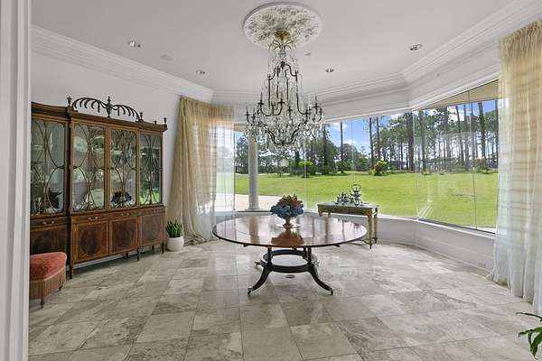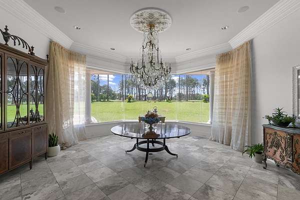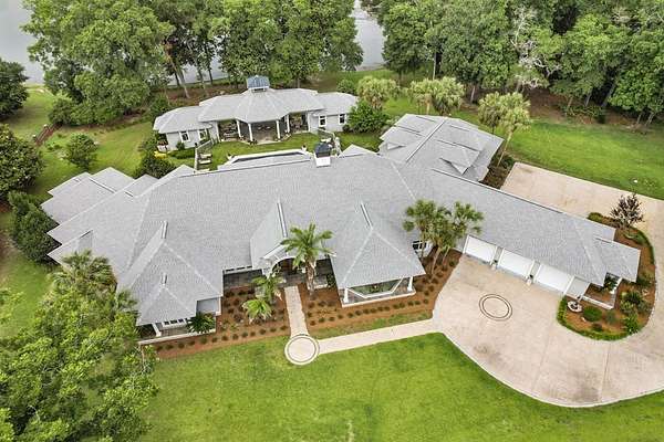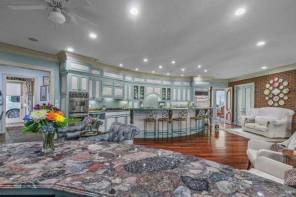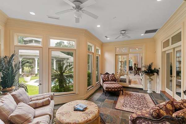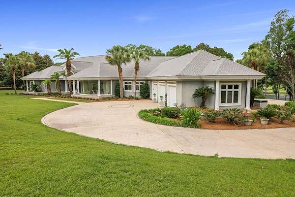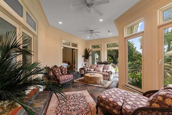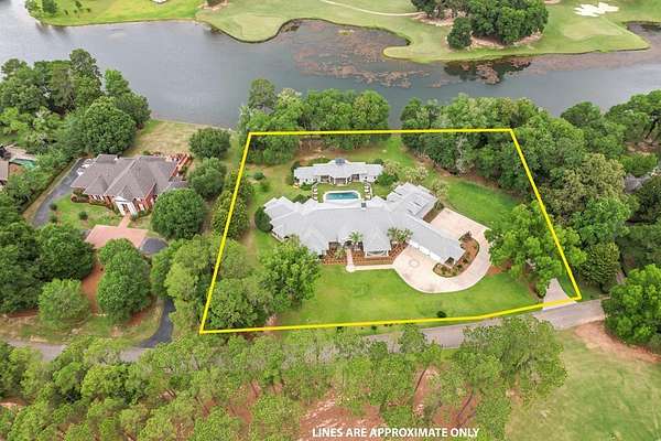 Welcome to an extraordinary executive estate in the heart of the highly sought-after Highlands Subdivision on Royal Highlands Drive. Nestled on 2 pristine acres with breathtaking lake views on one side and golf course views on the other, this custom-designed masterpiece offers the ultimate in privacy, craftsmanship, and refined Southern living. This expansive residence features 6 bedrooms, 4 full baths, and 2 half baths, thoughtfully designed to accommodate multigenerational living or a large family. The grand foyer welcomes you with custom stained-glass doors, marble wainscoting, and handcrafted crown molding you simply must see to believe. From the Brazilian Rain Forest hardwood floors to the two elegant sunrooms, every inch of this home speaks of timeless quality. The grand room is a showstopper, anchored by a gas fireplace and flooded with natural light from large operable windows. The kitchen is a chef's dream: oversized and open, featuring a 6-burner gas stove, double ovens, warming drawer, ice machine, and toe/under-cabinet lighting throughout. The adjacent bar area, large pantry, and custom cabinetry with pull-outs make this a true entertainer's space. Retreat to your massive primary suite with separate his and hers walk-in closets, spa-like ultra tub & sauna, and a luxurious steam shower with dual heads. The children's wing includes 4 spacious bedrooms, Jack & Jill baths with slate showers, oversized closets, its own den/playroom, and even a dedicated laundry room.