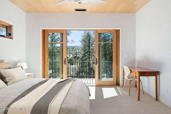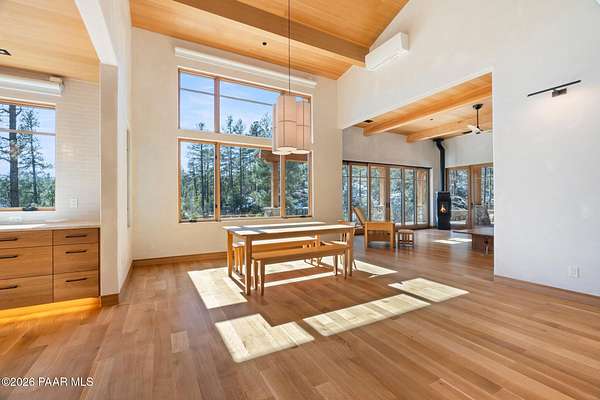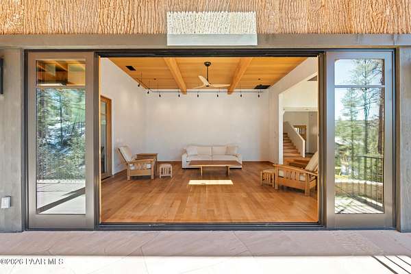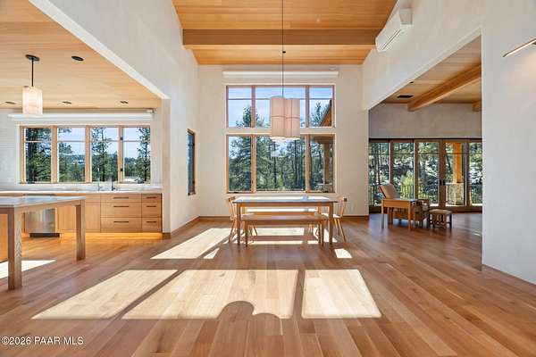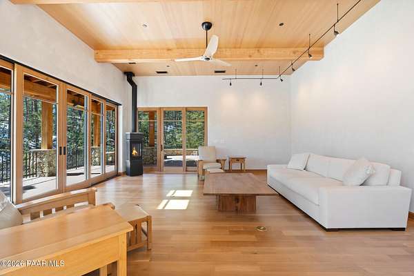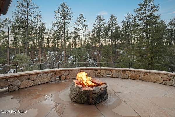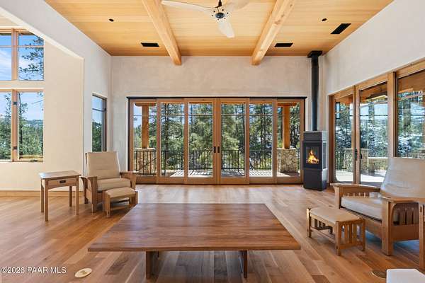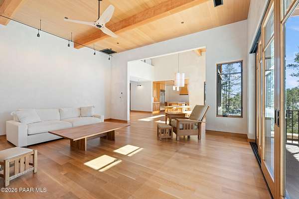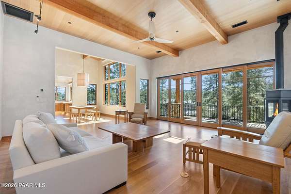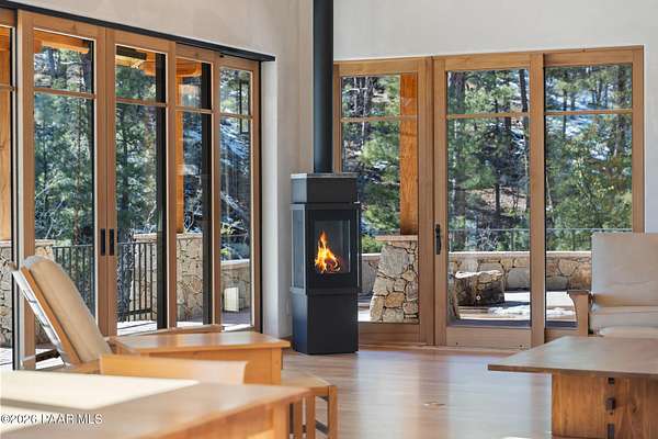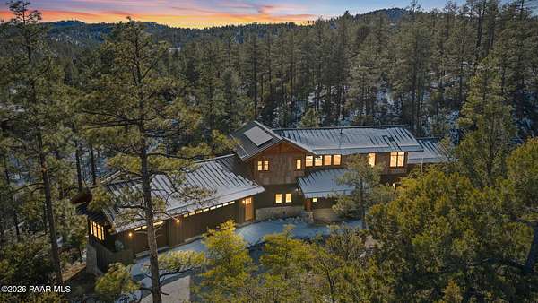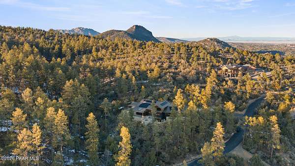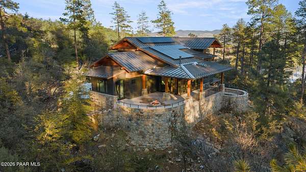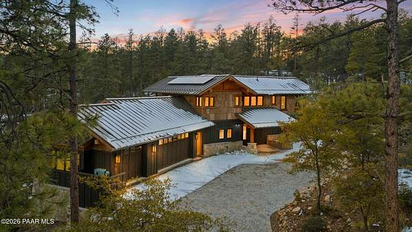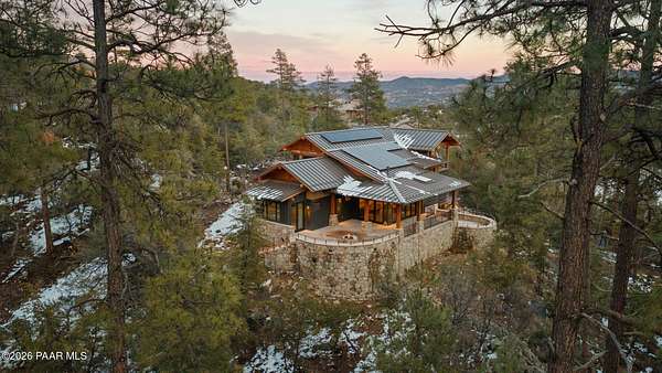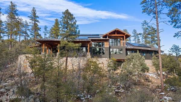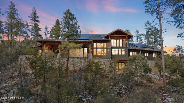 Architecturally significant modern luxury in the private gated community of High Valley Ranch -- located just minutes from historic downtown Prescott while offering exceptional privacy surrounded by pristine pines.Completed in December 2023 and only lightly lived in due to extensive travel, this custom-built, site-specific, near new, residence represents a distinct tier of construction within the community. Designed to integrate seamlessly with its pine forest surroundings, the main living areas were intentionally oriented to capture both sunrise and sunset, allowing natural light to define the interior experience throughout the day.Unlike many homes in the area, this residence is anchored by massive Arizona stone retaining walls rising from a full solid concrete foundation -- creating structural permanence, thermal stability, and sculptural presence. Rustic timbers and distinctive Poplar wood tiles enrich the exterior aesthetic, blending natural materials with modern refinement. A durable metal roofing system crowns the structure, selected for longevity and architectural cohesion.A dramatic retractable glass wall system forms the architectural centerpiece of the living room, opening fully to expansive outdoor entertaining spaces. This seamless indoor-outdoor living design creates year-round connection to the incredible landscape.Inside, refined modern finishes reflect elevated craftsmanship: hand-troweled plaster walls with smooth wax texture, white oak flooring, soaring ceilings approaching 20 feet lined with white oak veneer, and custom solid white oak soft-close cabinetry and drawers extending throughout the kitchen, bathrooms, and garage. Taj Mahal quartzite surfaces, solid wood doors, and carefully curated materials reinforce both durability and design integrity.The chef's dream kitchen anchors the main level with an expansive quartzite island, SubZero refrigeration, Wolf cooking appliances, Miele dishwasher, a thoughtfully integrated butler's pantry and beautiful views of the forest. The open-concept layout was designed for effortless entertaining while maintaining architectural cohesion.Spa-inspired baths feature heated natural limestone flooring and river rock walk-in showers. The main-level primary suite provides patio access and a cedar-lined walk-in closet, creating a private retreat designed for full-time living.Additional highlights include a Nexo freestanding gas stove, built-in gas fire pit, integrated patio heaters, plush wool bedroom carpeting, private theater room, stainless-steel chemical-free hot tub, large sauna, 15.4 kW solar system, multi-zone Mitsubishi climate control, whole house humidity control, whole-house water filtration and softener, and an insulated oversized three-car garage with EV charging, built-in heaters, custom cabinetry and stainless-steel sink.Purposefully constructed for long-term performance, this residence stands apart as one of High Valley Ranch's most recently completed architectural homes -- offering modern craftsmanship, structural integrity, luxury, and enduring design within one of the most beautiful natural settings in Prescott.You will find this homes ''Full Story'', ''Build Sheet - Narrative'' and ''Build Sheet - Bulleted'' in the listing documents.