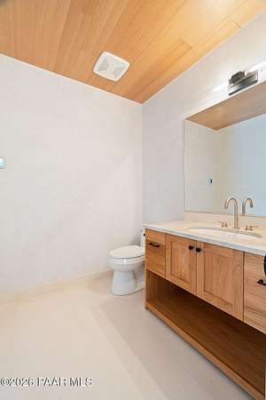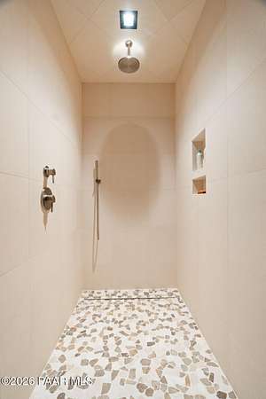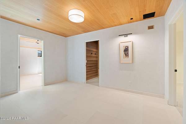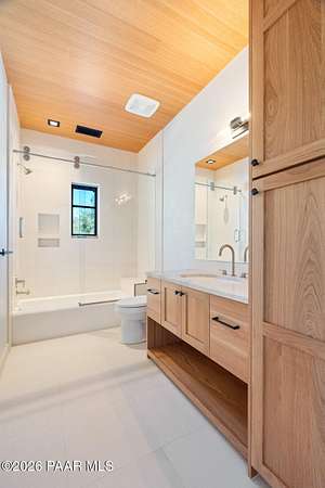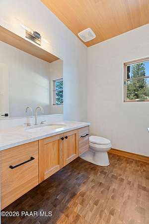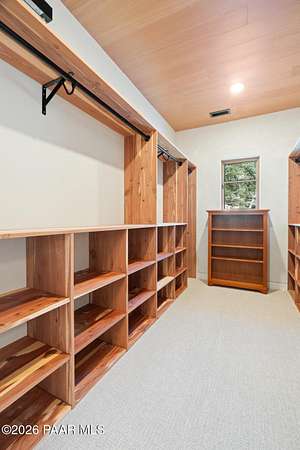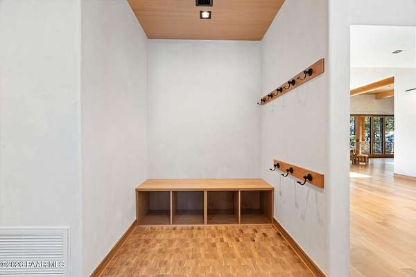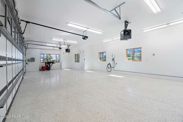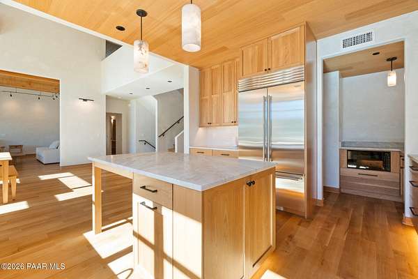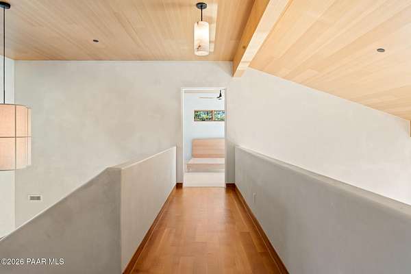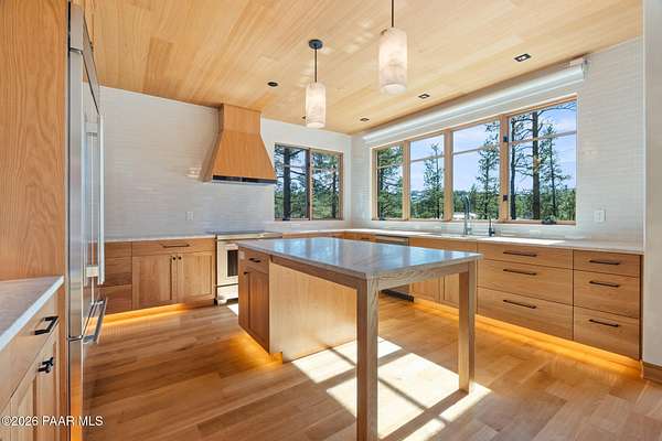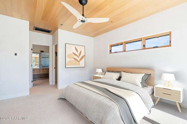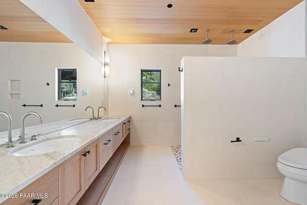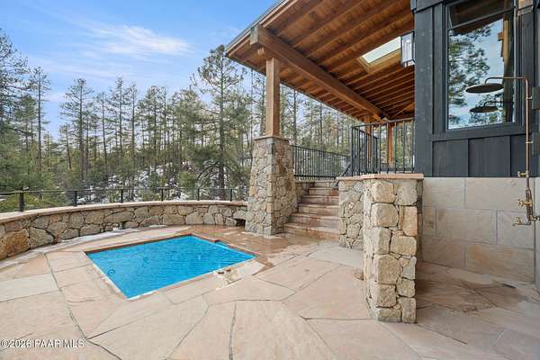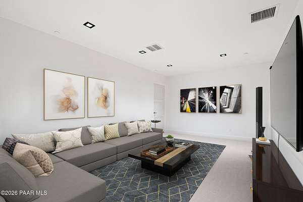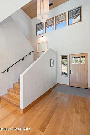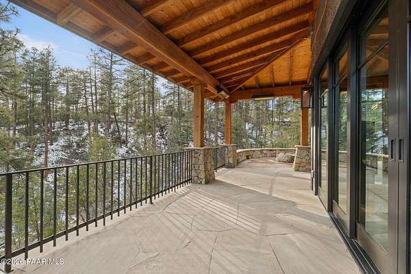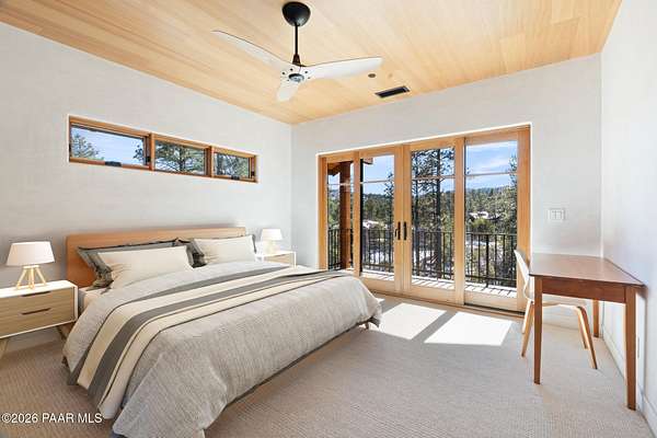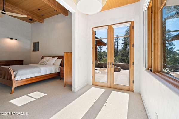 Architecturally significant modern luxury in the private gated community of High Valley Ranch -- located just minutes from historic downtown Prescott while offering exceptional privacy surrounded by pristine pines.Completed in December 2023 and only lightly lived in due to extensive travel, this custom-built, site-specific, near new, residence represents a distinct tier of construction within the community. Designed to integrate seamlessly with its pine forest surroundings, the main living areas were intentionally oriented to capture both sunrise and sunset, allowing natural light to define the interior experience throughout the day.Unlike many homes in the area, this residence is anchored by massive Arizona stone retaining walls rising from a full solid concrete foundation -- creating structural permanence, thermal stability, and sculptural presence. Rustic timbers and distinctive Poplar wood tiles enrich the exterior aesthetic, blending natural materials with modern refinement. A durable metal roofing system crowns the structure, selected for longevity and architectural cohesion.A dramatic retractable glass wall system forms the architectural centerpiece of the living room, opening fully to expansive outdoor entertaining spaces. This seamless indoor-outdoor living design creates year-round connection to the incredible landscape.Inside, refined modern finishes reflect elevated craftsmanship: hand-troweled plaster walls with smooth wax texture, white oak flooring, soaring ceilings approaching 20 feet lined with white oak veneer, and custom solid white oak soft-close cabinetry and drawers extending throughout the kitchen, bathrooms, and garage. Taj Mahal quartzite surfaces, solid wood doors, and carefully curated materials reinforce both durability and design integrity.The chef's dream kitchen anchors the main level with an expansive quartzite island, SubZero refrigeration, Wolf cooking appliances, Miele dishwasher, a thoughtfully integrated butler's pantry and beautiful views of the forest. The open-concept layout was designed for effortless entertaining while maintaining architectural cohesion.Spa-inspired baths feature heated natural limestone flooring and river rock walk-in showers. The main-level primary suite provides patio access and a cedar-lined walk-in closet, creating a private retreat designed for full-time living.Additional highlights include a Nexo freestanding gas stove, built-in gas fire pit, integrated patio heaters, plush wool bedroom carpeting, private theater room, stainless-steel chemical-free hot tub, large sauna, 15.4 kW solar system, multi-zone Mitsubishi climate control, whole house humidity control, whole-house water filtration and softener, and an insulated oversized three-car garage with EV charging, built-in heaters, custom cabinetry and stainless-steel sink.Purposefully constructed for long-term performance, this residence stands apart as one of High Valley Ranch's most recently completed architectural homes -- offering modern craftsmanship, structural integrity, luxury, and enduring design within one of the most beautiful natural settings in Prescott.You will find this homes ''Full Story'', ''Build Sheet - Narrative'' and ''Build Sheet - Bulleted'' in the listing documents.