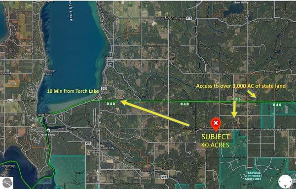 Est $1,828/moDesirable Alden Michigan, nice square 40 acres with rolling topography, some open areas, fronts on 2 roads. Great development potential! 10 minutes from Torch Lake and 1/2 mile to state land access of over 3,000 acres. Well, septic and power in place. Outstanding hunt property, maple, pine, oak and birch! Mobile home and contents included in sale. Mobile is winterized and has been vacant for years, Sold AS -IS!