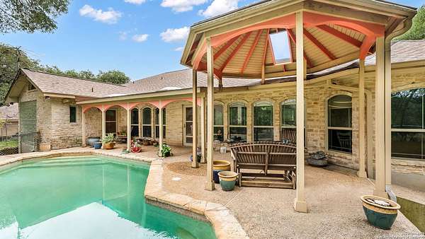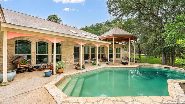 Tucked away on 6.21 peaceful acres, this one-of-a-kind property offers privacy, functionality, and room to live and work on your terms. Property comes with a private water well and backup generator. Car lovers or serious hobbyists will appreciate the three oversized garages built for more than just parking. These generously sized structures offer endless potential for a workshop, storage, home gym, or small business headquarters. Inside you have spacious living spaces, kitchens, and bedrooms. Outside the primary bedroom you have a patio and pool for relaxing. Located minutes away from 3009, 7.8 miles from the ever growing I-35 corridor, 10.5 miles from 1604, and 13 miles from the beautiful city of New Braunfels.