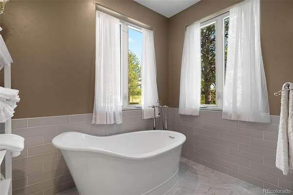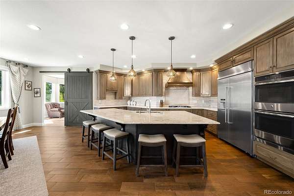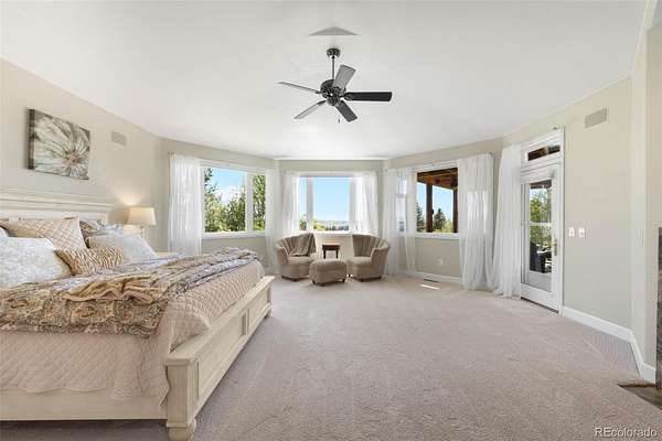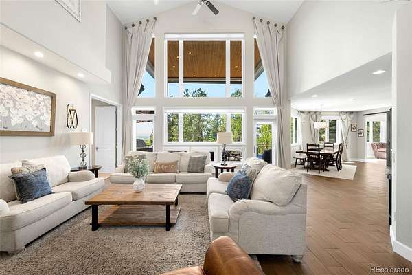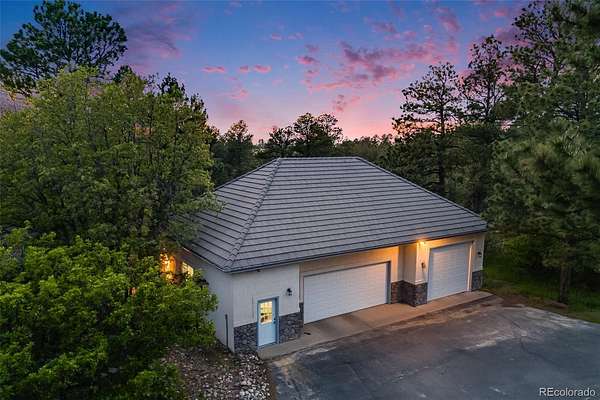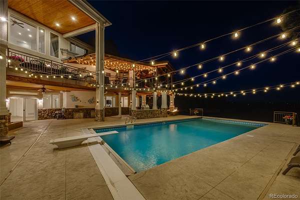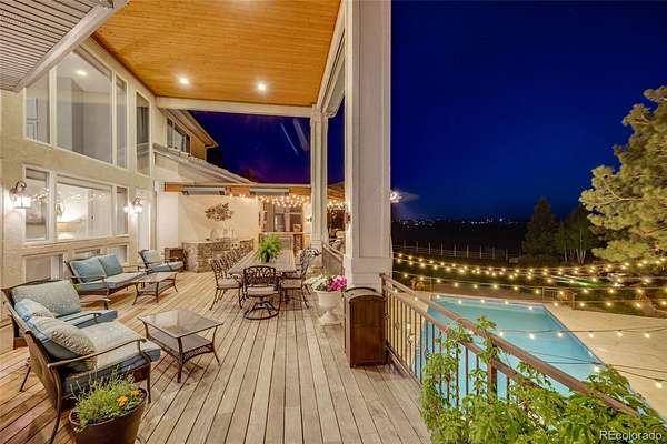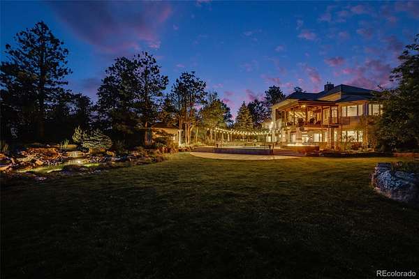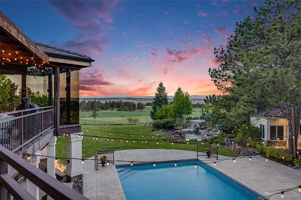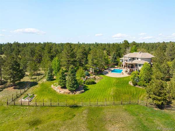 Welcome to a masterpiece of modern elegance at an exquisite gated estate located on the expansive grounds of Remmick Ridge in Parker, Colorado. This contemporary gem spans a generous 7,256 square feet, offering a harmonious blend of luxury and functionality. With five spacious bedrooms and seven bathrooms, this home ensures comfort and sophistication in every corner highlighted by a personal elevator that travels to all three floors of the home. The heart of the home is a stunning island kitchen, equipped with top-tier appliances including a cooktop, double oven, microwave, and refrigerator. The adjacent eat-in kitchen area offers seamless access to a private deck, perfect for alfresco dining and taking in breathtaking mountain views of Pikes Peak and the Front Range; enjoy the outdoors in cooler temperatures with mounted patio heaters. These views are best found in the all-weather sunroom that overlooks your 36.5 acres of serenity. The living spaces are generously sized, highlighted by a main floor primary suite complete with two walk-in closets, ensuring your personal retreat is both serene and luxurious. The full walk-out basement provides additional space for entertainment or relaxation, complemented by the charm of a cozy fireplace. Effortlessly entertain any kind of event from lounging next to the firepit to hosting a party around your salt water pool outfitted with a retractable pool cover. Enjoy casual conversation or personal reflection near the exclusive pond with dual water features. Feel a sense of privacy on your own 36 acre property with the fenced in and irrigated two acre backyard. Outside, the property boasts vast landscapes with an attached 4 car garage and a detached garage with RV parking with up to 12 spaces, ensuring ample space for all your toys and vehicles; other luxury amenities include water filtration system, water softener, and a whole home generator.