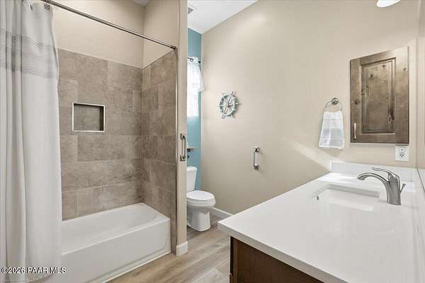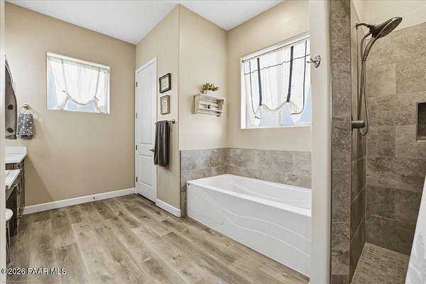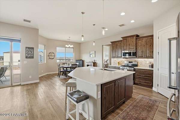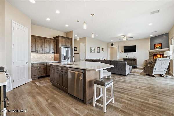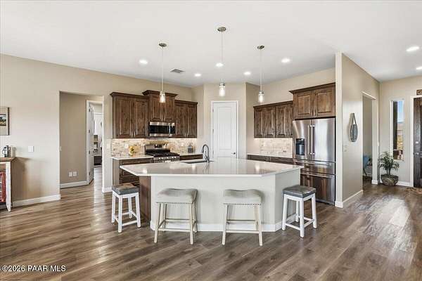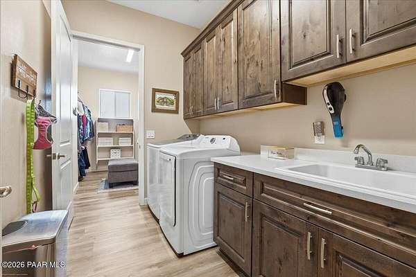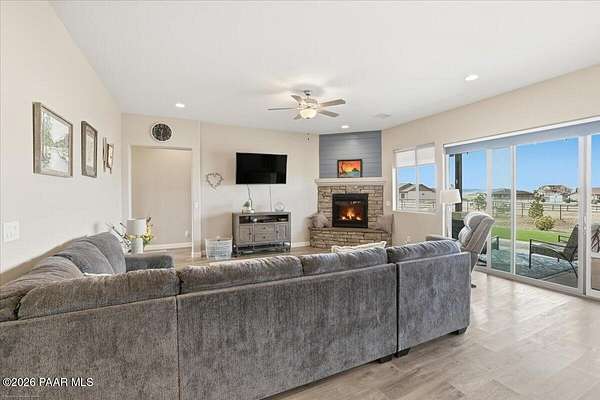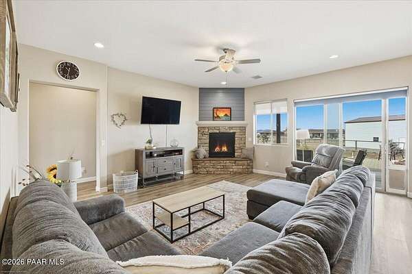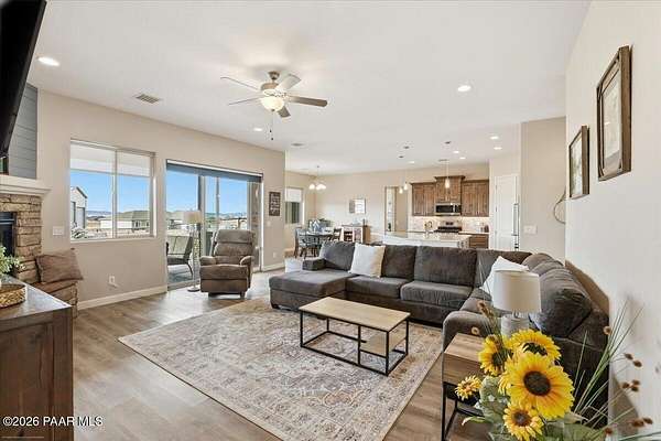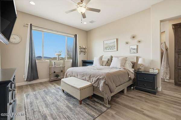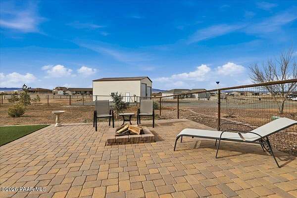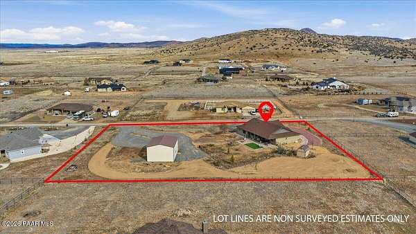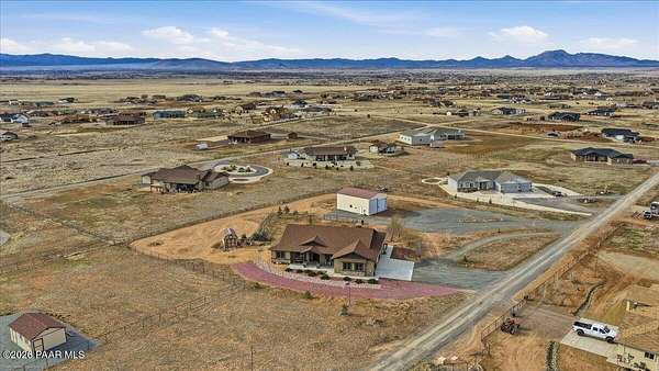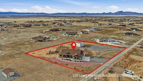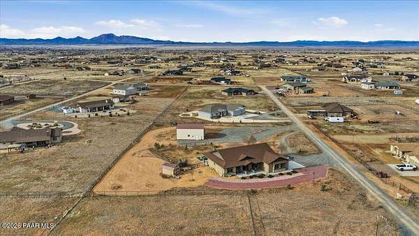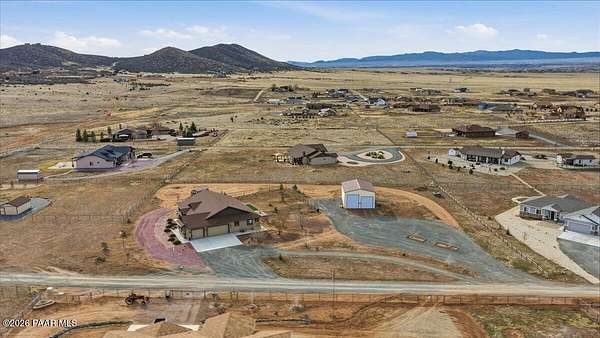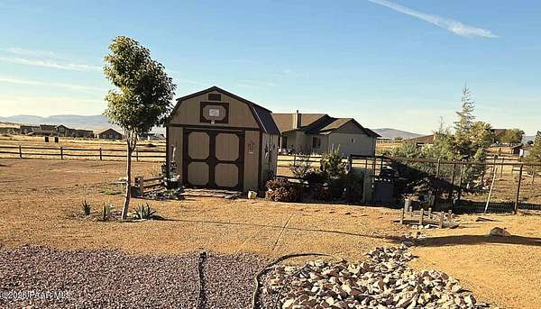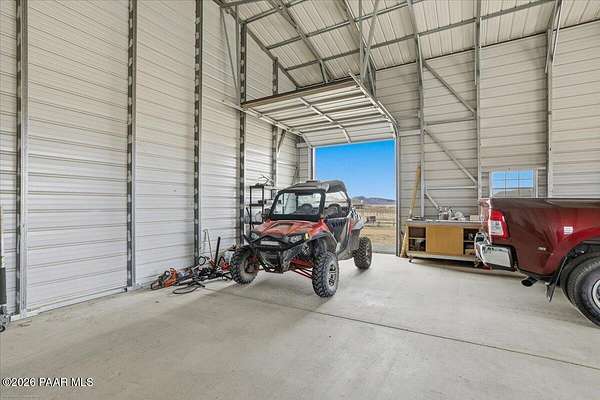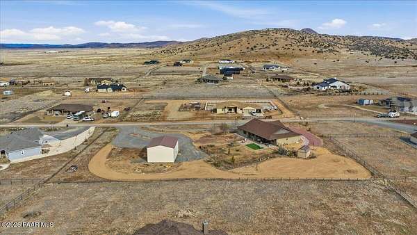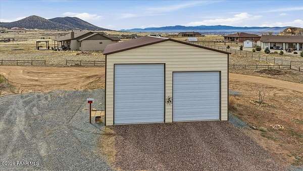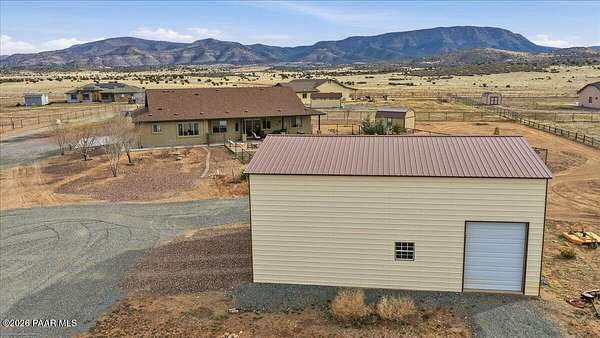 Discover wide-open space and country charm! This beautiful 4 bedroom, 2 bath custom home is set on 2 fully usable acres in Prescott Prairie. Designed for comfortable living and outdoor enjoyment. The spacious interior features a functional layout with generous bedrooms, light-filled living areas, and a welcoming chef's kitchen ideal for everyday living or entertaining. Home features a high-efficiency smart thermostat, luxury vinyl plank flooring, knotty birch cabinetry with soft-close throughout, and a newly installed electric sunshade on the back patio. Outside, the level acreage is perfect for pets, horses, trailers, RVs, or future improvements. Includes 6ft non-climb fencing at the back of the house for pets, children, etc. Plenty of space for corrals, barns, or gardens. The car enthusiast will no doubt be impressed with this rare garage space designed to house up to 7 vehicles!! The attached 3-car garage is 980 square feet and has plenty of space for the average buyer. An ADDITIONAL 1200 square feet detached garage includes 16ft, 12ft, and 10ft roll-up doors. This building can house up to 4 more vehicles!! Perfect for an RV, riding lawn mower, ATVs, trailers, work trucks, or any projects that you might have. Need even more storage? There is a 10ft x 16ft shed that will convey with the property and would make a perfect hobby room, workshop, or storage area. This gorgeous property is 5 minutes from state land access and located on a cul-de-sac for that peaceful country lifestyle. New owners are sure to enjoy the fire pit, views of Mingus Mountain, and those starry nights. This is a rare opportunity to own acreage with freedom, privacy, and true Western appeal.