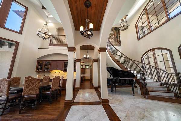 - Built-In Features, Ceiling Fans(s), Crown Molding, Eat-In Kitchen, High Ceilings, Kitchen/Family Room Combo, Living Room/Dining Room Combo, Primary Bedroom Main Floor, Solid Surface Counters, Solid Wood Cabinets, Split Bedroom, Stone Counters, Thermostat, Tray Ceiling(s), Vaulted Ceiling(s), Walk-In Closet(s), Window Treatments
