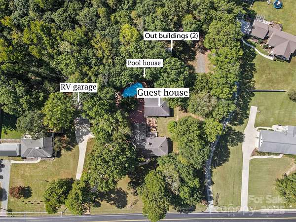 Charming 3-bedroom, 2-bathroom full-brick ranch home on a stunning 4.7-acre property! This home features a renovated kitchen with stainless steel appliances, a gas cooktop and granite countertops, a formal dining room, a formal living room and family room, as well as a beautiful sunroom surrounded by windows. The rest of the home includes two large secondary bedrooms with walk-in closets and a full bath, along with a primary bedroom with en-suite bathroom. Outside, you'll find an in-ground pool, covered patio, courtyard, as well as ample lawn space to enjoy! In addition to the main house, this property includes a studio apartment with a full bath and kitchenette, an oversized RV garage with lift and second-story walk-up storage, a small pool house, as well as two additional outbuildings that could be upfitted for a variety of uses! The 4.7 acres also features both wooded space and a large pond. Truly a unique property you will not want to miss!