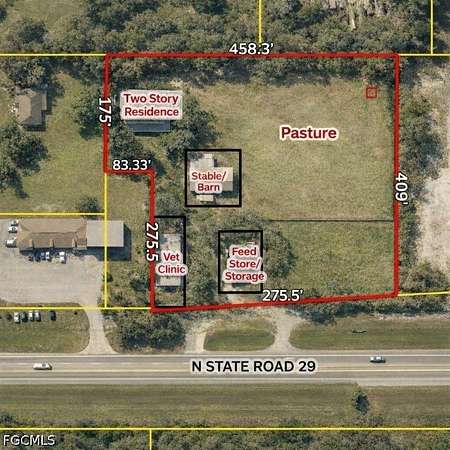This versatile property spans over 4+/- acres and is thoughtfully divided to support both business and residential use. The commercial portion includes three office/clinic buildings, two of which are connected by a kennel area, providing flexibility for veterinary services or conversion to other business types. The site is already zoned for convenience commercial use with a future land use of commercial, making it an attractive option for entrepreneurs needing space, accessibility, and exposure. In addition to the commercial facilities, the property features a 2+/- acre improved site, along with a separate 1/2-acre parcel that includes a spacious 3,150 sq. ft. two-story residence. Built in 2001, the home offers 3 bedrooms and 4 bathrooms, frame construction, and a durable metal galvalume roof-ideal for an owner-operator seeking the convenience of living on-site. Equestrian or agricultural capabilities are already in place with 2+/- acres of fenced pasture, complete with chutes and an arena area enhanced by LED lighting. Several pole barns, sheds, and accessory structures provide additional storage and utility. Nestled among beautiful native oak trees, this property captures the charm of Old Florida while delivering modern commercial potential. LaBelle continues to grow as a desirable bedroom community to Fort Myers, making this a strategic investment with strong upside. With its prime location, established clientele, and flexible layout, this property is well positioned for continued success-whether maintained as a veterinary clinic or reimagined for another commercial use. Please note: all structures will require TLC, offering the opportunity to customize and add value. Also available is an additional 4+/- acre residential tract featuring a CBS home and outbuildings-ideal for expansion, rental income, or extended family use.