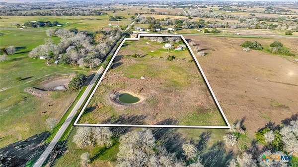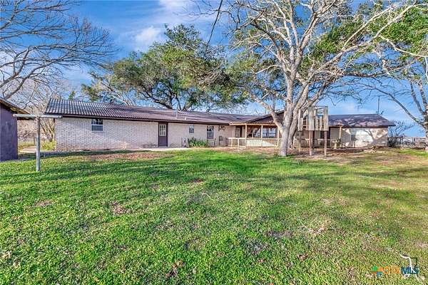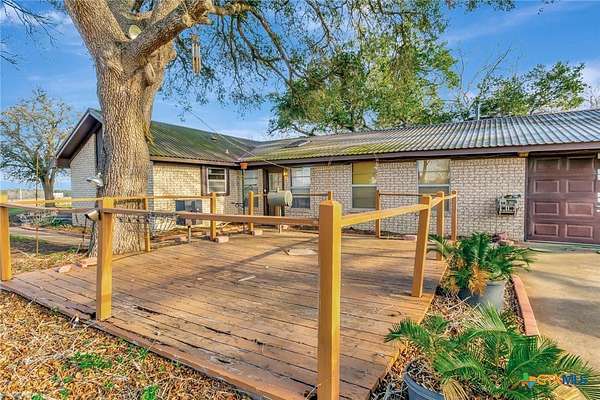 Set on 10.42+/- acres in Lavaca County, this rural property offers road frontage on two sides, rolling terrain, scattered trees, and a pond with no floodplain per appraisal. The single-story brick home features approx. 3,346 sq ft, 3 bedrooms, 3 bathrooms, plus an efficiency apartment connected by an enclosed breezeway. The home offers an open living area with exposed beams, brick fireplace, and covered front and back porches. Improvements include a 3-car attached garage, solar system, private well and septic, and multiple outbuildings including a barn with cattle pens and hay storage, pole barn, shop with concrete floor, and additional storage structures.