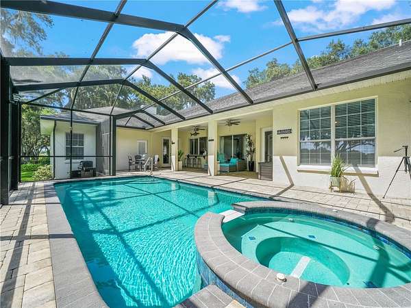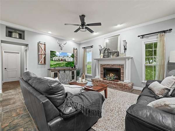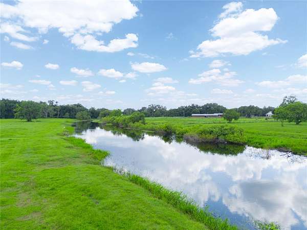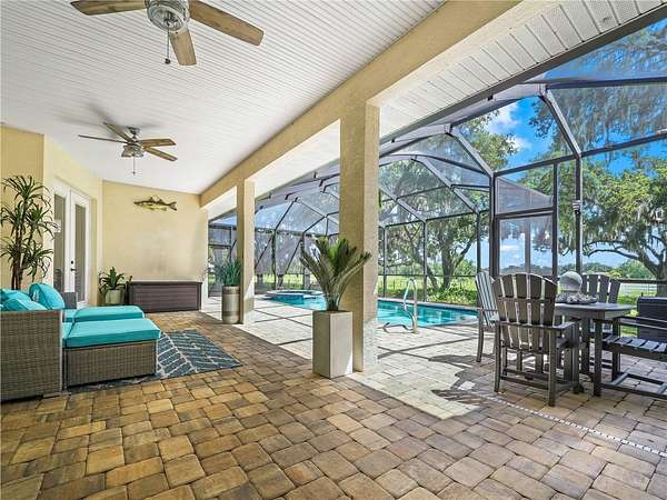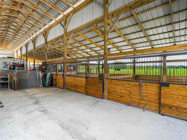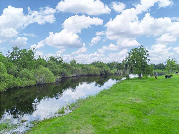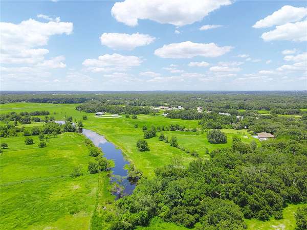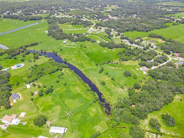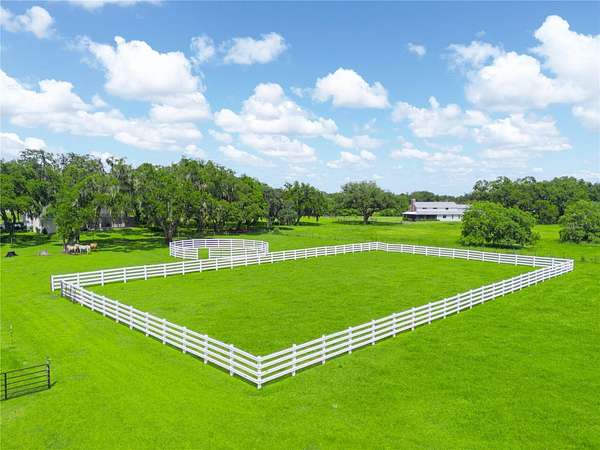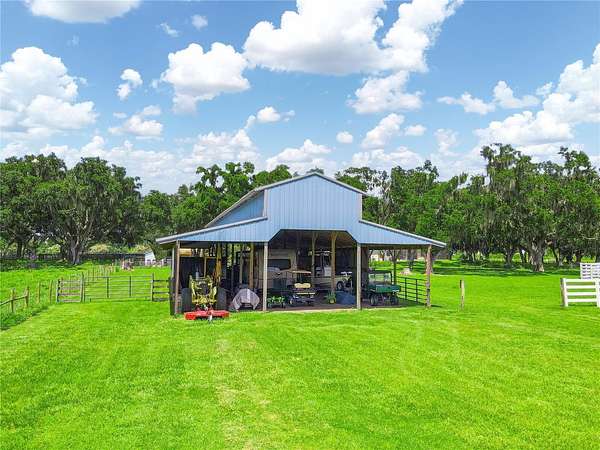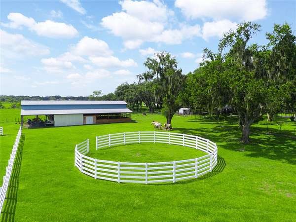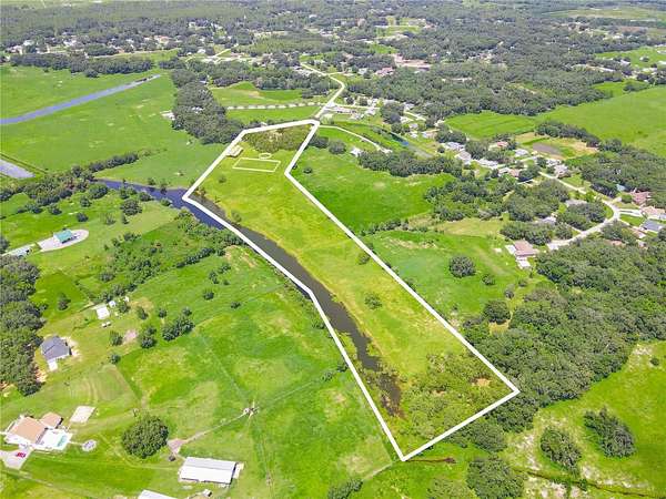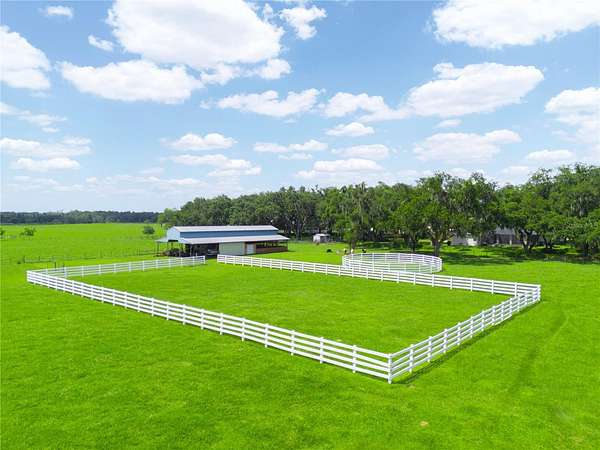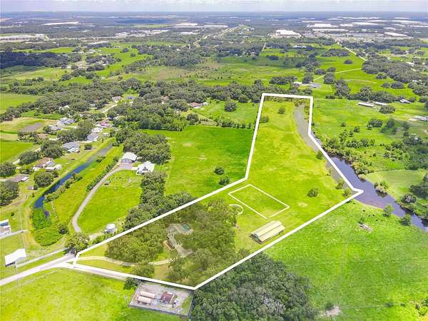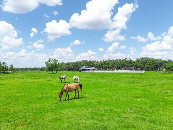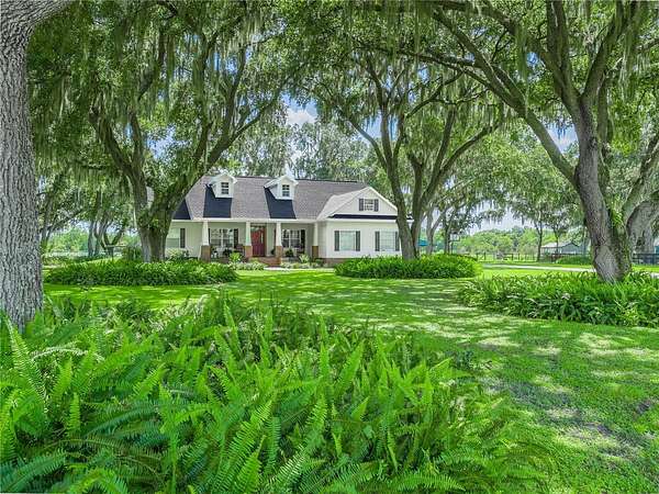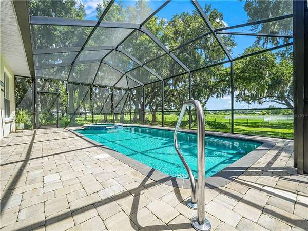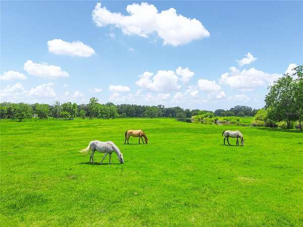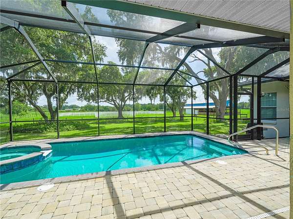 Nestled on a sprawling approximately 14.49-acre plot, this captivating house offers a peaceful and private retreat. The home features four bedrooms and three bathrooms, encompassing approximately 2,901 square feet of thoughtfully designed living space. BRAND NEW ROOF 4/2025. The majestic oaks lining the entrance create a charming and inviting atmosphere. Carefully designed with 6 courses of block and block foam filled walls. The window and sliding glass doors are double paned, the garage door insulated. Inside, the home boasts a double foyer that opens to the formal dining room and living room, featuring soaring ceilings, decorative niches, and crown molding. The private office, with its large window, provides an ideal setting for a home workspace. The kitchen showcases Kraftmaid cabinetry, black galaxy granite countertops, and brand-new appliances. The separate dinette area offers a private entry to the lanai through French doors, creating a serene and inviting space. The expansive family room, with its wood-burning fireplace, provides ample room for family gatherings and relaxation. The primary bedroom, a generously sized suite, features a private sitting area and French doors leading to a private entry to the pool area.The primary bathroom boasts a decorative tile shower, luxury vinyl plank floors, a soaking tub, double sinks, double walk-in closets, and a separate water closet. The inviting lanai overlooks the lush pasture, offering a calming environment. The property also boasts an impressive 1,300 feet of creek, 600' walk from creek with teeming with fish, and a 50-by-95-foot, 6-horse stall barn, equipped with automatic water and 100-amp service, allowing for future loft expansion and 12 x 12 tack/tool room. Horse lovers will love white vinyl fenced riding arena with round pen. The property also features an oversized 2.5-car side-entry garage and ample parking on the long concrete driveway.