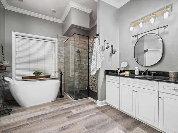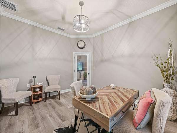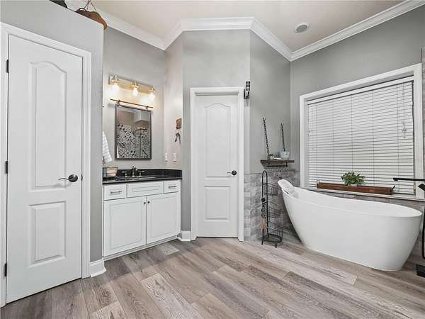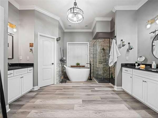 - Ceiling Fans(s), Crown Molding, Eat-In Kitchen, High Ceilings, Kitchen/Family Room Combo, Living Room/Dining Room Combo, Open Floorplan, Primary Bedroom Main Floor, Solid Surface Counters, Solid Wood Cabinets, Split Bedroom, Stone Counters, Walk-In Closet(s)