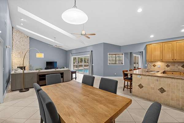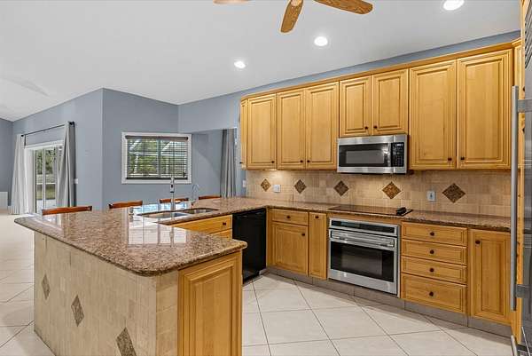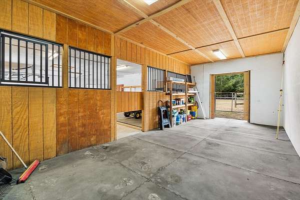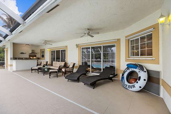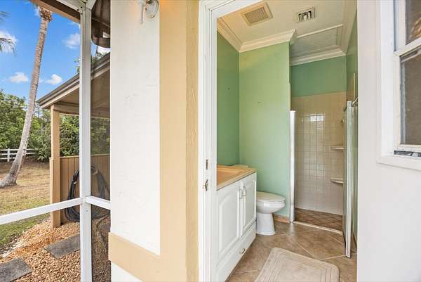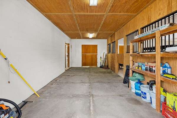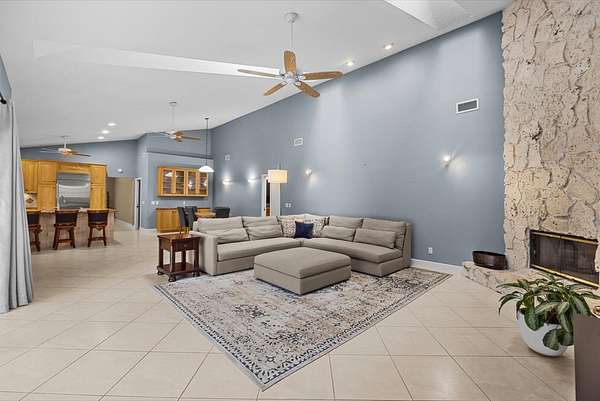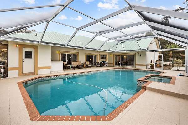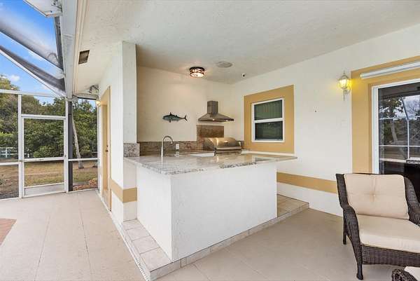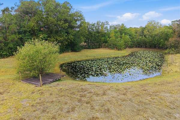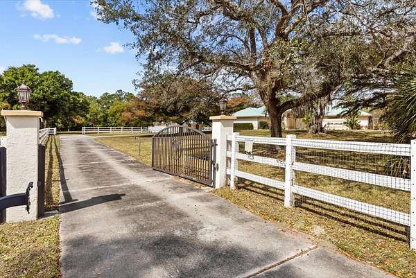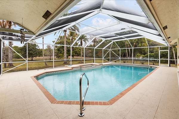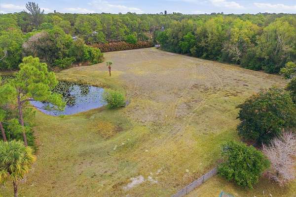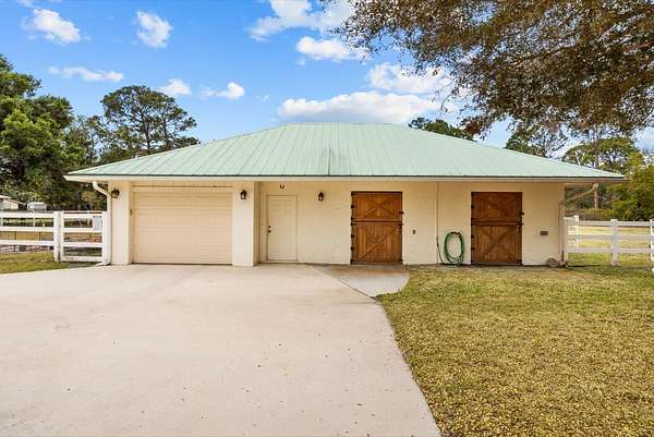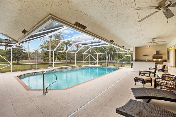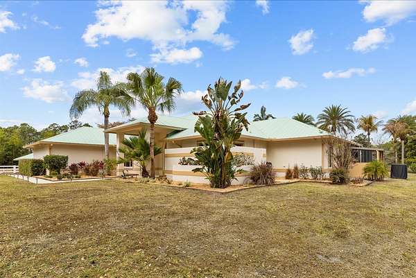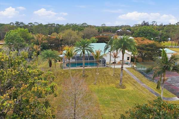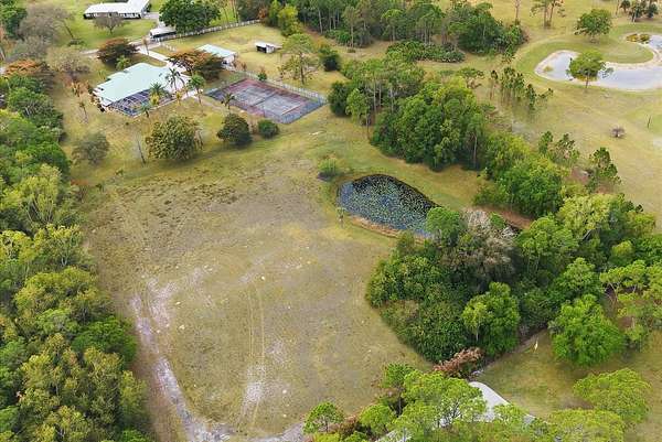 Five acres, 2.5 acres with separate entrance off North dead end road, ready to build. 2.5 acres with home, barn, and more off South dead end road. Property is gated and fenced. The home has cathedral ceilings with a 14' coral rock wood-burning fireplace in the family room, with sky lights open to kitchen and breakfast area. Kitchen features Sub Zero refrigerator, Wolf convection oven, Bosch dishwasher. Washer, dryer and mini refrigerator in laundry room. Formal living room and Dining room off foyer. Home has 4 or 5 bedrooms depending on use. Three and a half bathrooms. Master suite has sliders to pool, large bathroom with sunken shower, two sink areas and walk-in closet. There is a 15' X 12' office w/built in wood shelfs off master bedroom, could be children's room. Central vacuum system. 20' X 20' Bonus room used as bedroom or guest quarters between laundry room and 1 car attached garage. Exterior has 20' X 40' saltwater pool with jacuzzi style tub all screened, outdoor kitchen with Granite counters, 30" American Outdoor Gas Grill, Mini refrigerator, sink and storage. There is a 1350 SF barn with one car parking and John Deere tractor entry. Tractor and cart included with sale. Covered out buildings behind barn. Tennis court fully fenced could be pickle ball court. Mature landscaping with Avocado, Mango, and Orange trees. All furnishings within home included with sale. HOA is for roads $590.00 per year. Seller is a licensed Florida Real Estate Broker.