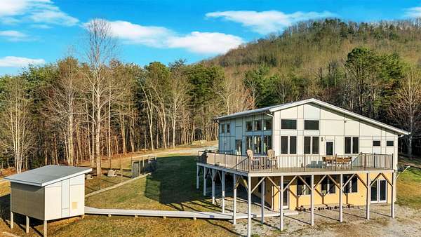 Set high along a ridgeline of Paint Mountain, part of the beautiful Blue Ridge range, this 32-acre retreat unfolds from a commanding ridgetop elevation down to a gentle mountain valley. The land encompasses two contiguous parcels: a finely crafted, high-performance main residence on 27 acres, and a 3,200-square-foot multi-use workshop on an adjoining 5-acre tract. With uninterrupted views, direct access to vast, protected lands of the Cherokee National Forest, and no land restrictions, the property offers a rare balance of architectural quality, long-term versatility, and total privacy. It's an ideal setting for a self-sufficient estate, multi-generational/ multi-family compound, or a creative retreat with space to live, work, and grow. The main house combines low maintenance design with age-in-place sensibility. At 1,640 finished square feet on the main floor, it features two bedrooms, two baths, and a dramatic great room with 14-foot ceilings and walls of windows that frame panoramic views from every angle. Two glass doors open to an 80-foot Azek deck that redefines indoor-outdoor living. Interior features include light-tone hardwood floors, pocket doors, open-plan kitchen and living areas, and a spa-like ensuite bath with a curbless double-shower. Downstairs, a full walk-out lower level adds another 1,600 square feet, with 10-foot ceilings, huge windows, and polished concrete floors. Already stubbed for another bath and with radiant heat in the floor, this space is ready for additional bedrooms, a separate guest suite, or an indulgent hobby studio, doubling the livable square footage with minimal effort. Across the woods with its own private driveway, the 3,200-square-foot workshop is equally impressive in quality and adaptability. With 12-foot ceilings, continuous insulation, abundant natural light, and a polished concrete floor throughout, the space is currently configured as a large art studio and business office. It includes a full bath, a laundry, covered porches, and all of the mechanicals needed for residential or commercial use. The barndominium start can serve as a guest residence, a second primary dwelling for extended family use, or a hub for entrepreneurial pursuits. Two additional 20x30 insulated outbuildings provide room for garages, storage, stables, or more workspace. The acreage is a mix of forest and level pasture. It has been maintained without chemicals and offers excellent sun exposure and ample flat areas for gardens or events. There are no limitations on use. You can build houses on 9 additional already surveyed lots, you can raise horses or simply enjoy the serenity. And just by stepping past your property line, you are in the heart of the Cherokee National Forest, more than 650,000 acres of protected wilderness at your feet. Step into a world of endless trails, fly-fishing streams, cascading waterfalls, and quiet swimming holes, all without ever needing to start your car. It's a naturalist's paradise, alive with deer, wild turkey, and the soundscape of the forest. Whether you're drawn to backcountry adventures or simply want the freedom to roam, this property connects you directly to one of the largest expanses of wild public land in the eastern U.S., a rare and priceless extension of your own backyard. Paint Mountain Retreat is only 25 minutes to Greeneville-a historic and friendly town with all the conveniences you may need. It's a scenic one-hour drive to Asheville or Knoxville, and under 90 minutes to the AVL, TRI or TYS airports. Outdoor enthusiasts will appreciate the property's proximity to the Appalachian Trail and the region's many lakes and rivers. Enjoy all four seasons in their full beauty-from spring wildflowers to autumn's brilliant foliage-without Mother Nature's harsh extremes. To explore detailed maps, building plans, and additional photos, visit. Shown by appointment only.