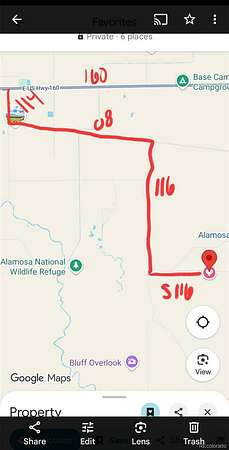 From Alamosa take road 114 south turning left on to county road 8 S and at 116 turn Right and it will bend into 116 S. There is a cattle gate to enter the property