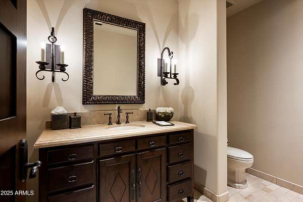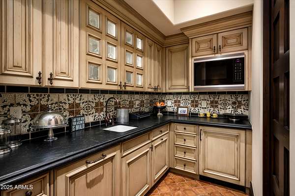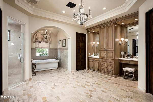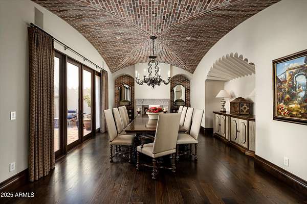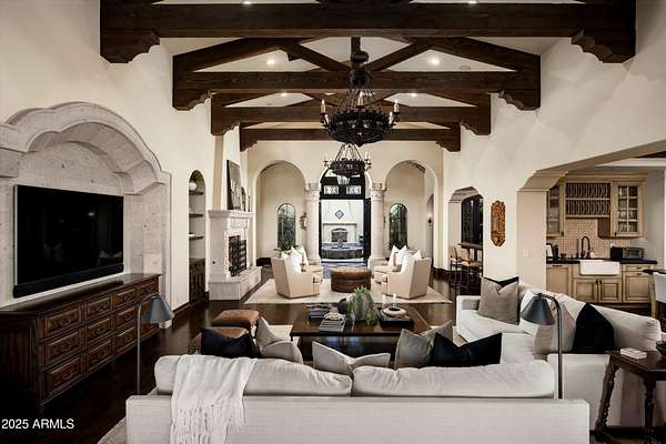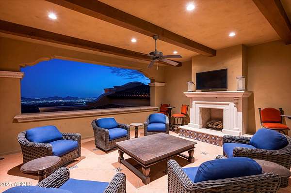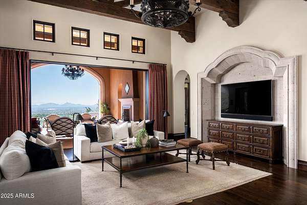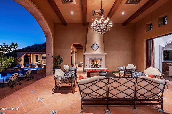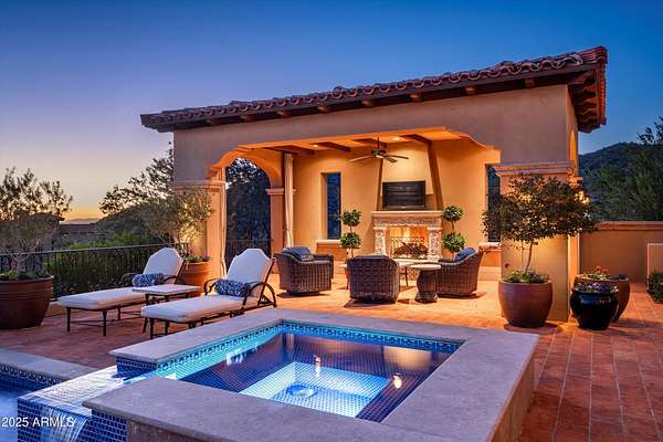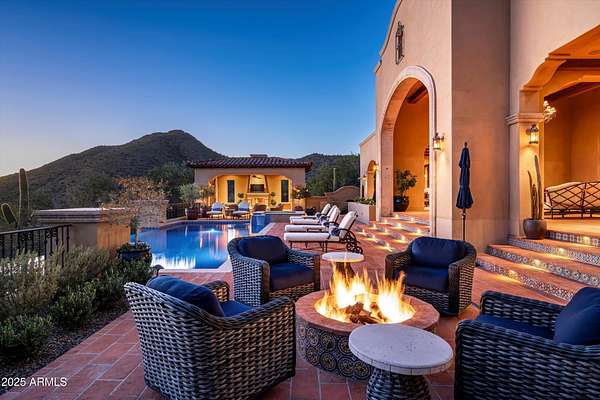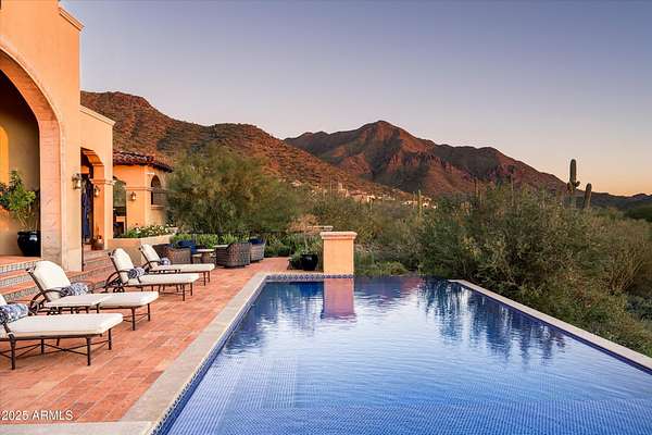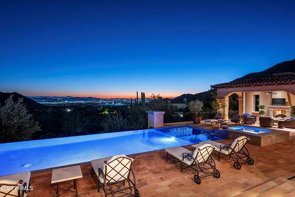 Perched in the coveted Upper Canyon of Silverleaf, this architectural masterpiece captures the essence of Scottsdale luxury living-where the indoors and outdoors blend seamlessly against a backdrop of endless mountain silhouettes and sparkling city-light vistas. Situated on a premium corner homesite with a postcard worthy mountain backdrop, arrive through the gated auto court to the home's entry courtyard with its tranquil water feature which sets an unmistakable tone of serenity and sophistication. Inside, the great room serves as the heart of the home, drawing the eye outward through disappearing glass walls to a breathtaking panorama of the valley below. The indoor-outdoor living experience defines this residence. A generous covered patio spans the entire rear of the homecomplete with built-in heaters, a fireplace, and multiple lounge and dining areasall oriented toward a negative-edge pool that appears to cascade into the cityscape. Whether entertaining under the stars or unwinding beside the fire pit with mountain silhouettes beyond, every moment feels cinematic. The luxurious kitchen is both warm and refined, featuring weathered-leather granite, double islands, two-tone custom cabinetry, and top-tier Wolf appliances, including a six-burner gas cooktop with griddle, opening to the outdoor covered dining terrace and outdoor kitchen. Wood-beam ceilings and artisan tile accents add texture and depth throughout. The open dining room connects beautifully to the courtyard, framed by a brick cross vault ceiling that gives a nod to timeless craftsmanship. The primary suite is a sanctuary of privacy and light, opening directly to the patio for peaceful mornings and glowing sunset views. Secondary ensuite bedrooms are thoughtfully split, offering space and comfort for family or guests. A handsome executive office with built-ins provides an ideal retreat for productivity or quiet reflection. A private elevator and patio stairs both lead to the guest residence, where guests enjoy their own living area, kitchenette, two ensuite bedrooms and a view balcony overlooking both the mountains and the city belowa true extension of the home's effortless hospitality. Throughout, appreciate refined elegance with nine charming fireplaces, custom wood flooring and distinguished beamed ceilings, gracious brick and tile accents and a wet bar with wine wall reflect the home's attention to detail and artistry. Every space tells a story of craftsmanship, comfort, and connectionto the desert, to the sky, and to the extraordinary lifestyle that defines Silverleaf. This is not just a homeit's an experience, unfolding across every sunset, every reflection in the pool, and every gathering that flows from courtyard to canyon view.