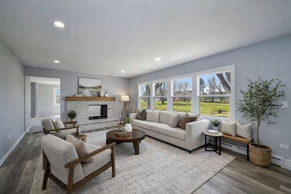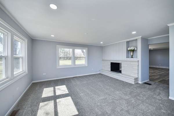 Rare opportunity to own a 2.29-acre parcel in Naperville, located in unincorporated Will County and backing to the prestigious White Eagle subdivision with scenic golf course and park-like views. This exceptional, fully usable property features mature trees and a private setting, offering endless possibilities to enjoy, expand, or build your custom dream home. The existing ranch-style home has been extensively updated with a new kitchen, updated baths, new windows, flooring, carpeting, fresh paint, and added recessed lighting. The home offers three bedrooms and two full baths, including a private ensuite, along with a spacious living room and a family room highlighted by a beautiful stone dual-sided wood-burning fireplace. A generous eat-in kitchen opens to a convenient front deck area. Additional features include an expansive full unfinished basement, an oversized two-car garage, new driveway (2025), hot water heater (2026), sump pump (2026), and a newer roof (2018). Ideally located near shopping, dining and within the highly acclaimed and award-winning Naperville School District 204. A truly rare opportunity to secure acreage, privacy, and location all in one.