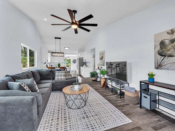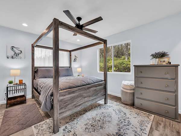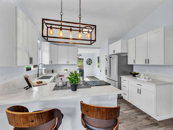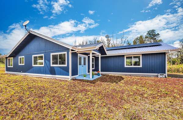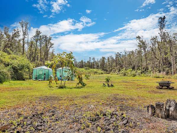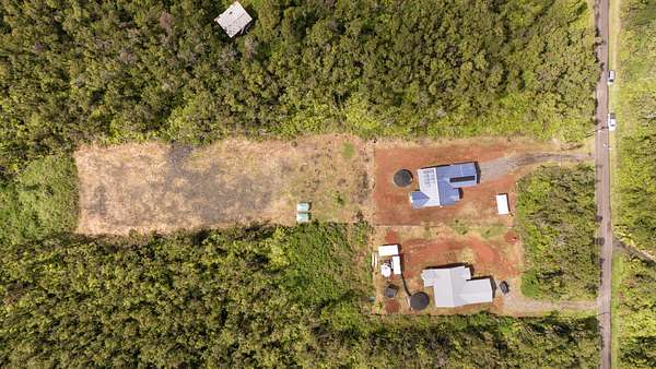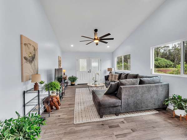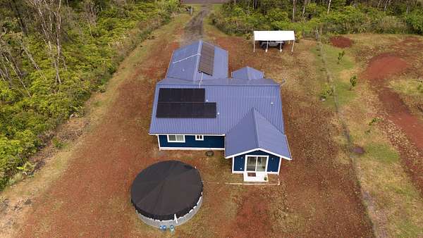 Enjoy country living on this 2-acre property in Fern Acres, offering a comfortable home and plenty of room to garden, play, and enjoy the outdoors. A good portion of the land is already fenced and cleared, creating functional outdoor space while the rest remains natural. The yard includes a wide variety of established plants and trees such as calamansi, tangerine, lilikoi, bananas, sugarcane, coffee, miniature coconut trees, and striking rainbow eucalyptus. Two 8 x12 greenhouses sit side-by-side, ideal for year-round gardening and plant starts. The home features an attached garage, propane cooking, and tall 40 inch kitchen cabinets that give the kitchen a more elevated, luxury feel along with generous storage. A pantry provides extra storage, ideal for larger grocery runs. Energy efficiency is supported by a Sunrun photovoltaic lease with Tesla battery backup already in place. There is also a gate at the front of the property. Inside, you will find an open living area with vaulted ceilings, a modern kitchen with stainless steel appliances, solid surface countertops, and soft-close custom cabinetry. The spacious primary bedroom includes its own ensuite bathroom, and the layout is designed for comfortable everyday living. A great opportunity for anyone looking for a newer home with land, established plantings, and dedicated space for gardening and outdoor enjoyment.