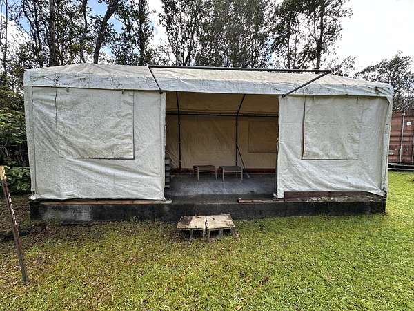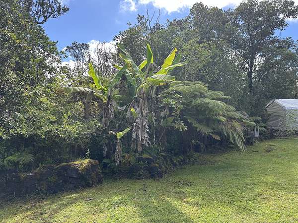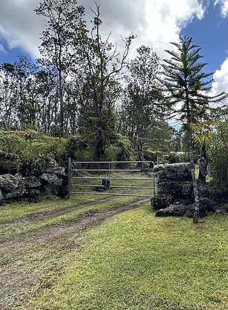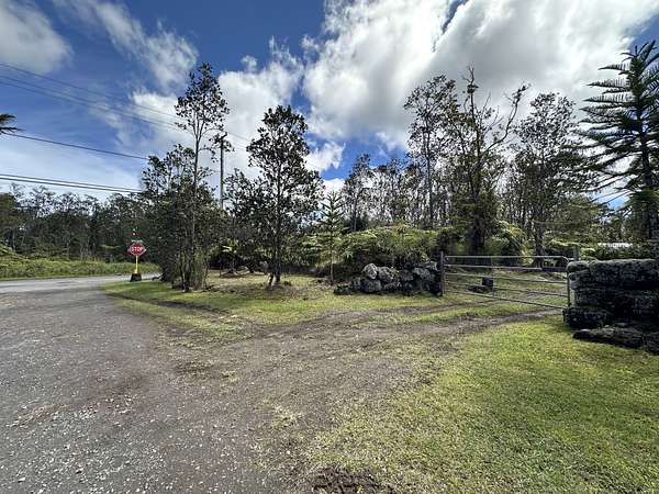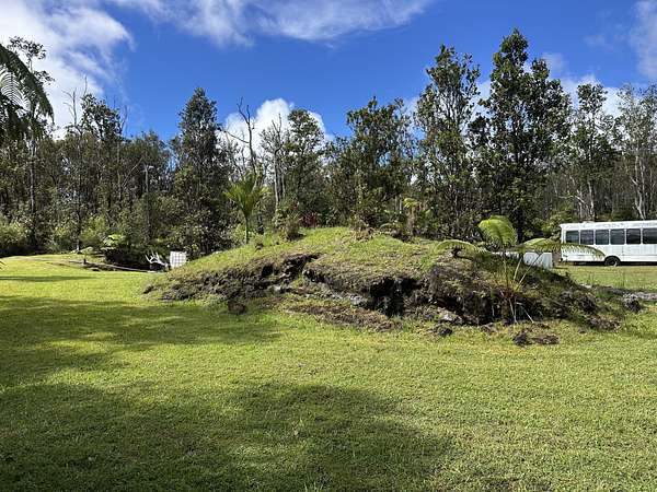 Enjoy country living on this square corner property located not far off the Hwy at the intersection of Kahaualea and Kilikaa Rd. in the Volcano area. Approximately 3000 ft elevation, the property has a large grassy yard, Established landscaping, Lava rock feature with a pond, and Several rock walls. Improvements include a large 27 ft wide water catchment tank that holds approximately 12,500 gallons 40-ft container (9'6" tall) with a sliding glass door installed to separate the rooms. A semi-flushing outhouse toilet 24 ft bus with windows and a 10 x 20 Thick cement slab All this makes it easy to stay on the land while Planning or building your dream home. This prime volcano location offers both convenience and the chance to enjoy the peaceful county lifestyle this area is known for. Great property in a great location ready for your vision to come to life. Property is gated, so do not try to go on the property with out an appointment.