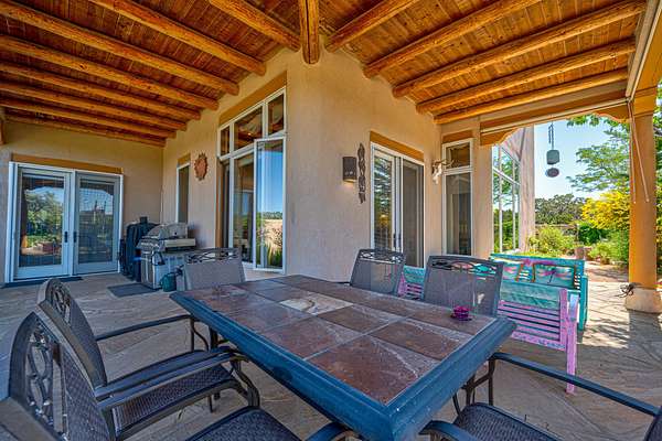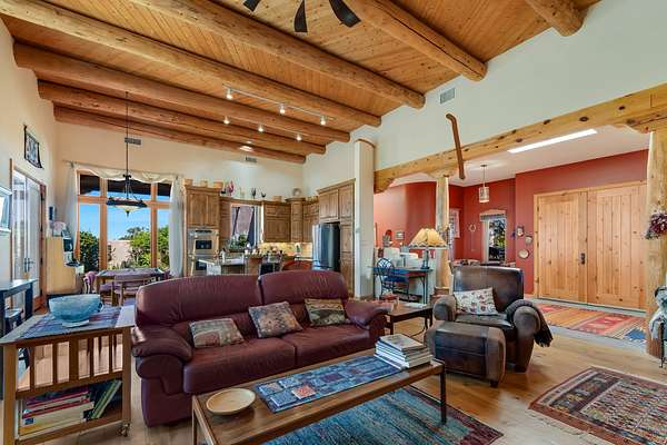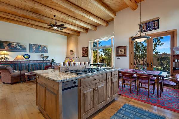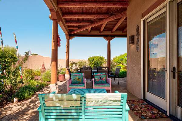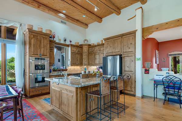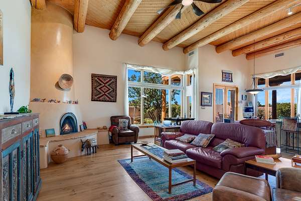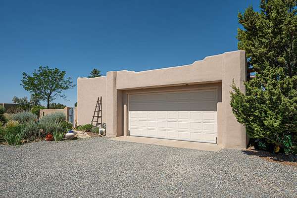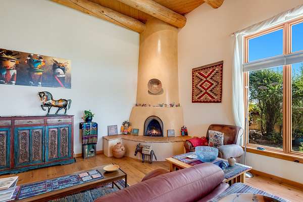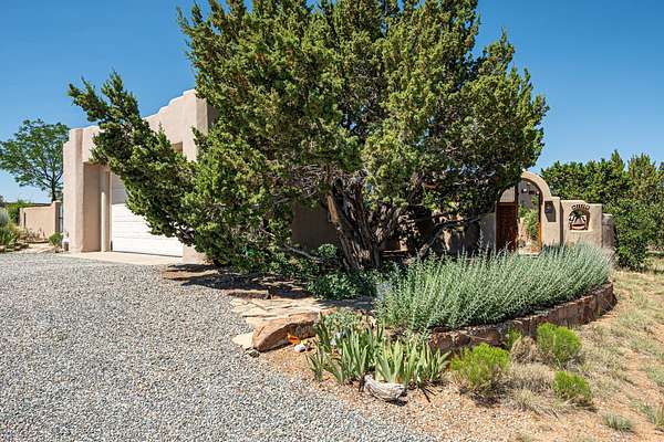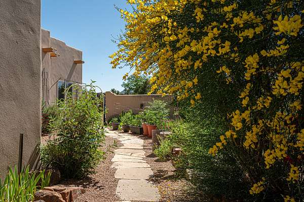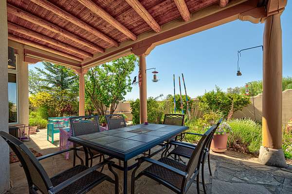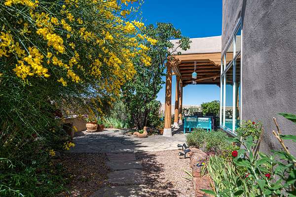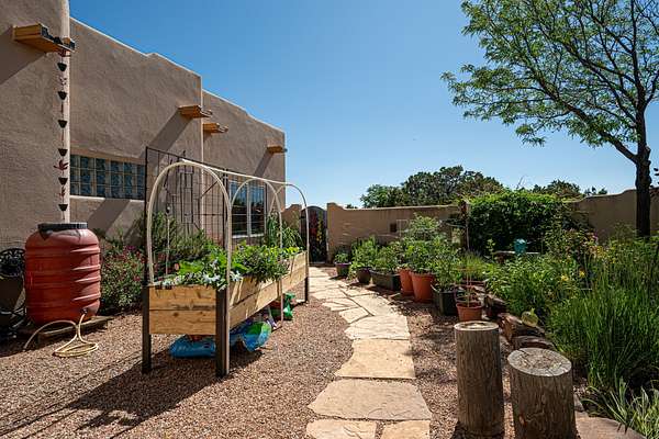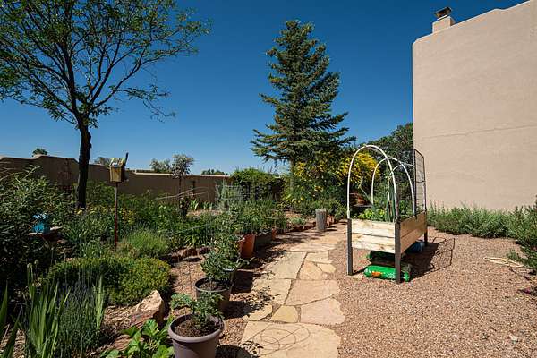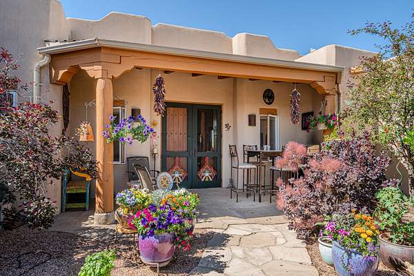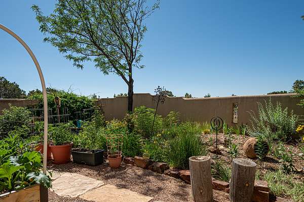 Exquisite Eastside Santa Fe 2700 sq.ft home in Eldorado built by Timothy House. Two beautifully landscaped, well established walled gardens create a private oasis on the south, west and north sides offering delightfully colorful views from the long grand 14ft high great room and dining room ceiling with 8ft high Pella windows. French doors lead out onto a large portal and 3 fireplaces including one in the garden for enjoyable outside entertainment. Viga beams, bancos, corbels and nichos add to the Santa Fe ambience and character. A lovely well designed kitchen featuring a large central island, granite counter tops, travertine backsplashes, custom cabinetry and updated appliances. The large owners suite includes a sitting area and kiva fireplace. A new silicone roof was installed in 2023 with a 20 year transferable warranty. A two zone central GFA heating and air-conditioning system on the roof makes for comfortable living year round. The guest area includes a large office which can double as a 3rd bedroom, the Murphy bed is not attached and will not be staying. There is even a secluded area for growing your own veggies. All this with Eldorado amenities close by, local shopping and services only minutes into Santa Fe.