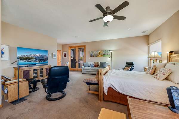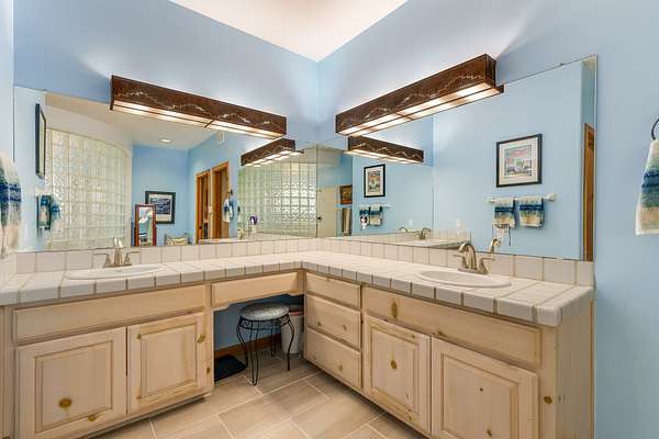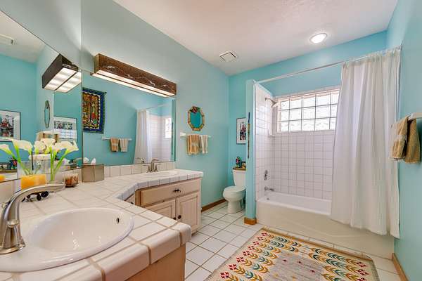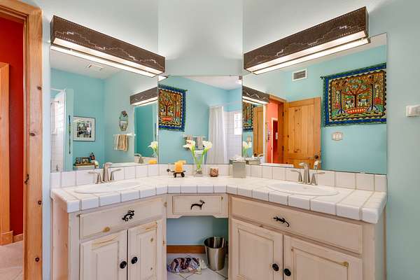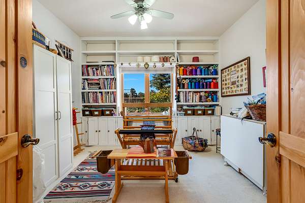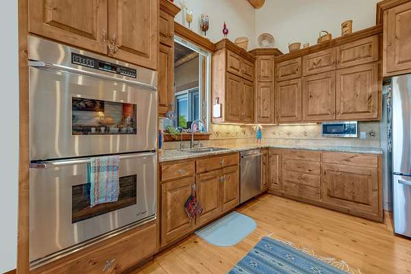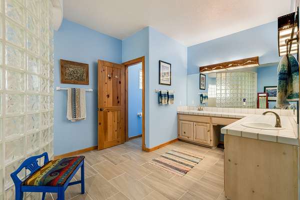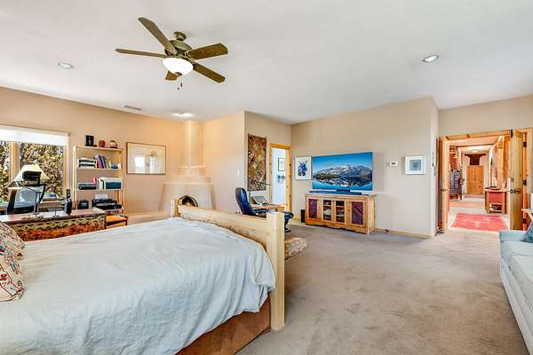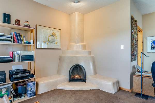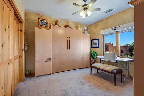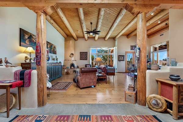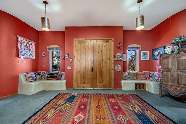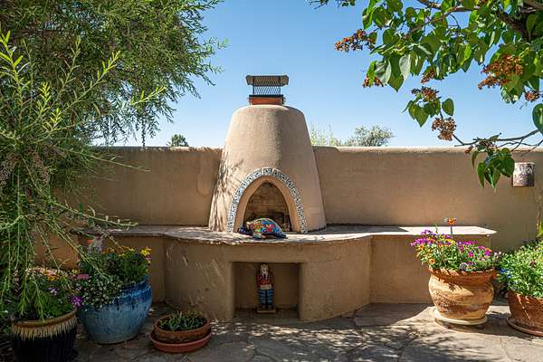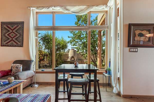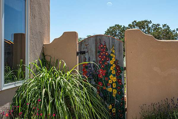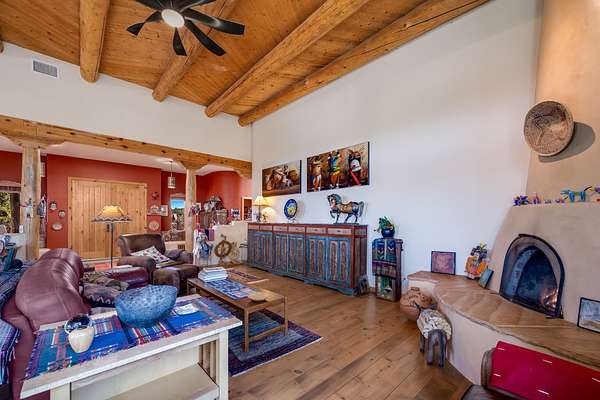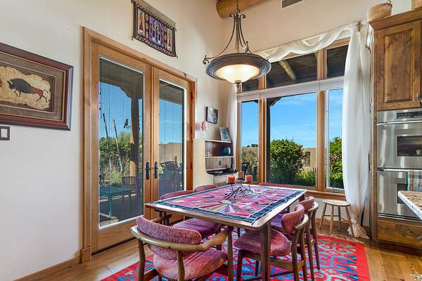 Exquisite Eastside Santa Fe 2700 sq.ft home in Eldorado built by Timothy House. Two beautifully landscaped, well established walled gardens create a private oasis on the south, west and north sides offering delightfully colorful views from the long grand 14ft high great room and dining room ceiling with 8ft high Pella windows. French doors lead out onto a large portal and 3 fireplaces including one in the garden for enjoyable outside entertainment. Viga beams, bancos, corbels and nichos add to the Santa Fe ambience and character. A lovely well designed kitchen featuring a large central island, granite counter tops, travertine backsplashes, custom cabinetry and updated appliances. The large owners suite includes a sitting area and kiva fireplace. A new silicone roof was installed in 2023 with a 20 year transferable warranty. A two zone central GFA heating and air-conditioning system on the roof makes for comfortable living year round. The guest area includes a large office which can double as a 3rd bedroom, the Murphy bed is not attached and will not be staying. There is even a secluded area for growing your own veggies. All this with Eldorado amenities close by, local shopping and services only minutes into Santa Fe.