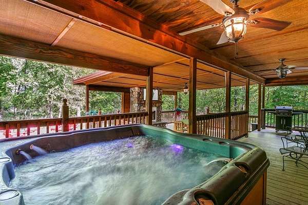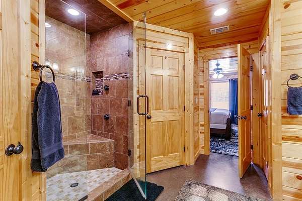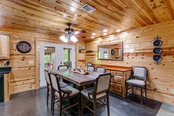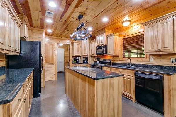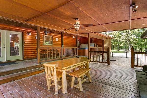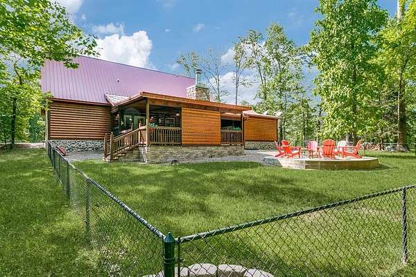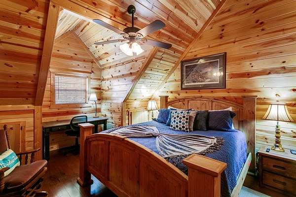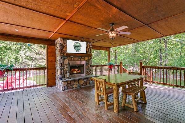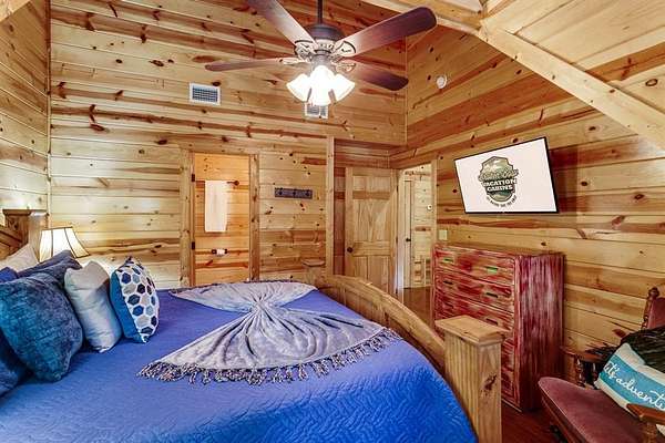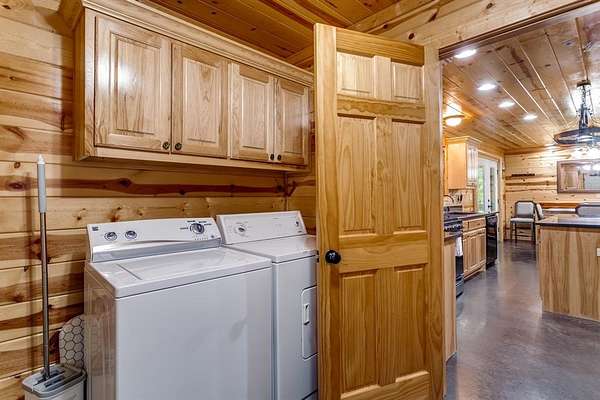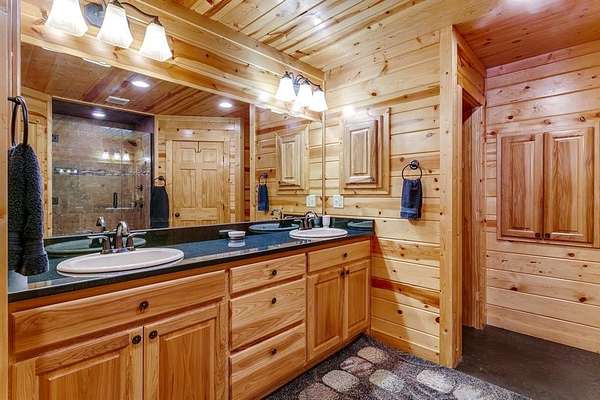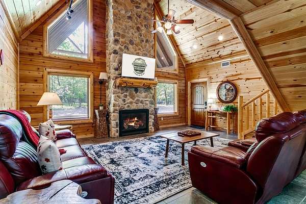 4 Bed 3 bath, in Oak Ridge Addition. Lady Luck is one of the great classic Hochatown cabins. Located on the entrance road to Beavers Bend State Park and approximately a half-mile from the Choctaw Landing Casino and Resort , this cabin is in the perfect location for a great family get away. This cabin offers covered parking, a two-car garage and a fenced backyard! The warm welcoming interior offers recliner style sofas in from of the gas burning fireplace (seasonal (Oct-Apr) and large screen TV. The large kitchen offers plenty of counter space for meal preparation. Appliances include double door refrigerator, gas range/oven, microwave and dishwasher. The coffee pot has option of carafe (a small amount of coffee and filters are provided) or the option of K-cup (not provided). There is a dining table that seat 6 persons There are 2 downstairs bedrooms The bedroom to right of living area has a king bed, a dresser for storage of personal items and a TV. The attached bath has an oversized tile shower and double vanities. The bedroom to the left has a queen bed, a closet and dresser for storage, & TV. This attached bath has a shower/tub combo and single vanity. There is 1 bedroom upstairs. It has a king bed, dresser, closet and TV. The attached bath has a stall type shower and single vanity. The large drive is perfect of multiple cars or a boat trailer.