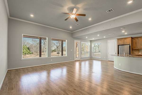 Incredibly stunning rare opportunity! Enjoy three acres of quiet living in the picturesque neighborhood of Canyon Ranch. This gorgeous 3-bedroom, 2-full baths, with high ceilings throughout, impresses with a large and spacious floor plan. Upon entry, you are greeted by an inviting foyer that brings you into the heart of the home. The incredible 6x6 windows bring the outdoors in. The kitchen opens to the family room with seating at the bar covered with beautiful granite counters, cabinet space throughout and a walk-in pantry. The spacious utility room just off the kitchen is equipped with a granite counter, sink and overhead cabinets. The primary bath is complete with granite counters, double sinks, separate sitting areas, grand walk-in shower, and a huge walk-in closet. Be amazed by the view from the covered patio looking out over the lovely pond and active wildlife.