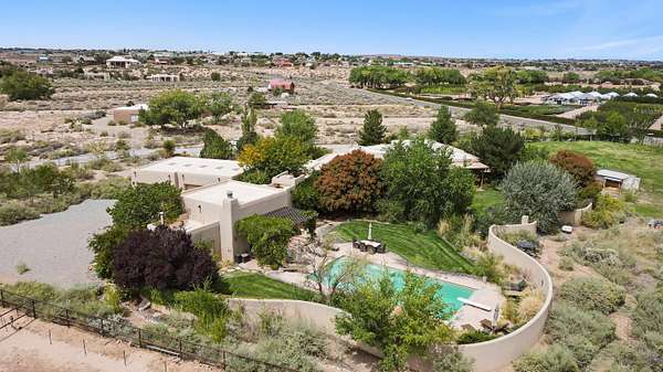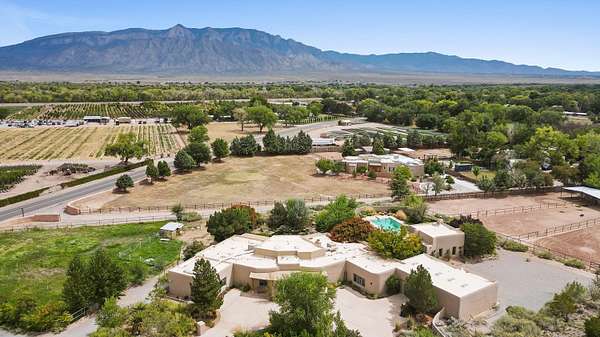 Introducing a rare opportunity to own a truly exceptional estate on 2 pristine acres at the highly sought-after north end of Corrales. With flexible seller financing options of 6% APR amortized over 30 years*, this one-of-a-kind property presents a rare opportunity to own a true Corrales masterpiece. This home would be perfect for a multi generational living situation. Having breathtaking, unobstructed views of the Sandia Mountains, this custom residence blends privacy, elegance, and superior craftsmanship in one of the area's most desirable locations. Built in 1999 by acclaimed builder Bill Bell of Sonoma Construction, the home features 8-inch Insulated Concrete Forms (ICFs), providing exceptional structural integrity, energy efficiency, and a remarkably quiet indoor environment. Inside,