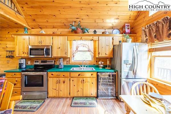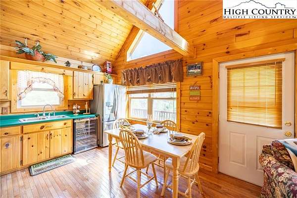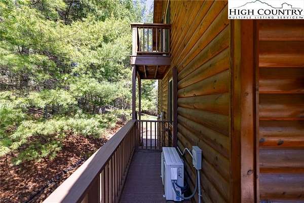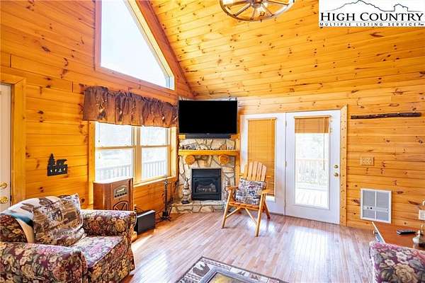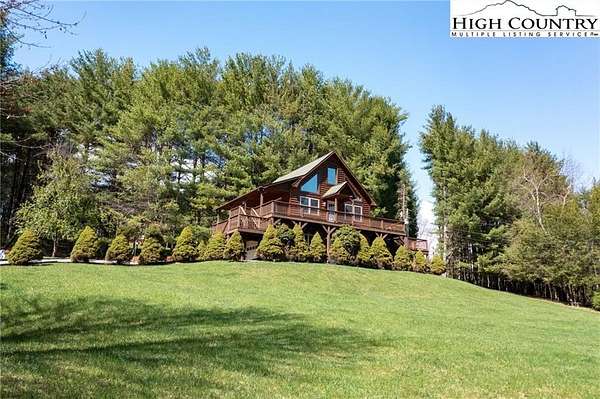 Perched on a scenic knoll, this inviting log-sided home offers peace, privacy, and nice views across nearly 3 acres. The property includes three additional building sites, all overlooking a serene community pond. Nestled in a quiet gated community in northern Alleghany County--just minutes from the New River and close to the Virginia state line--this home is a true mountain retreat.The gently rolling terrain is rich with wildlife and features access to four community ponds, perfect for nature lovers. Inside, the main level boasts tongue-and-groove interior finishes, and multiple windows that fills the space with natural light, and hardwood floors in the great room. A stunning stone fireplace creates a cozy centerpiece, while the kitchen offers newer stainless steel appliances--including a wine refrigerator. The main-level primary bedroom and bath provide convenient one-level living, while the open loft upstairs features a second bedroom and full bath. A unique spiral staircase leads to the lower-level den with more tongue-and-groove charm and its own private entrance--ideal for guests or a separate living space.The basement garage includes a washer and dryer, plus room for tools or equipment. Two separate driveways on either side of the house add to the home's functionality and flexibility. Enjoy outdoor living year-round with a mix of covered and open-air spaces. Located approximately 30 minutes from West Jefferson and Sparta, and less than 20 minutes to Independence, VA. Grayson Highlands State Park is just a short 15-20 minute drive away.
