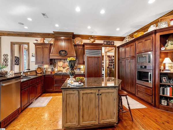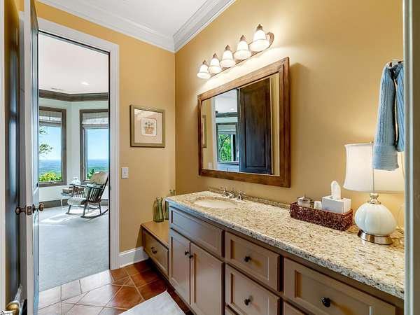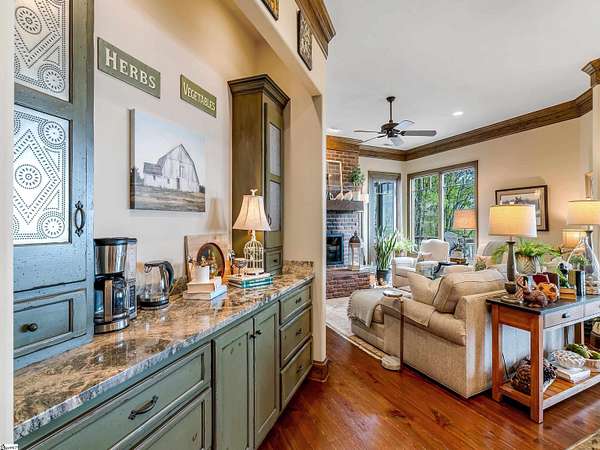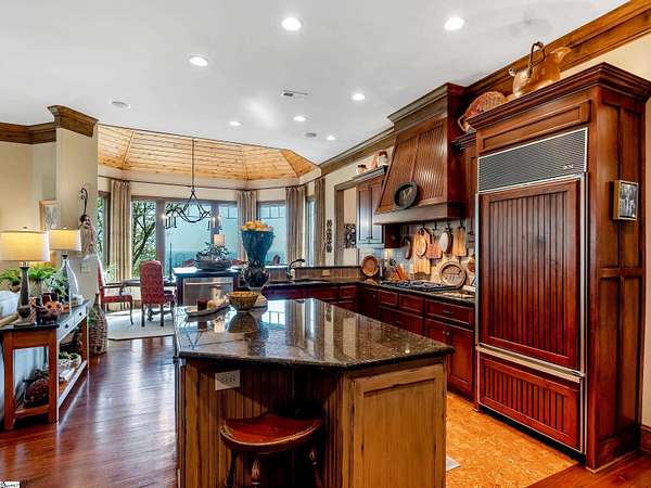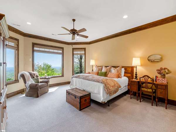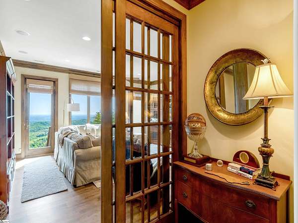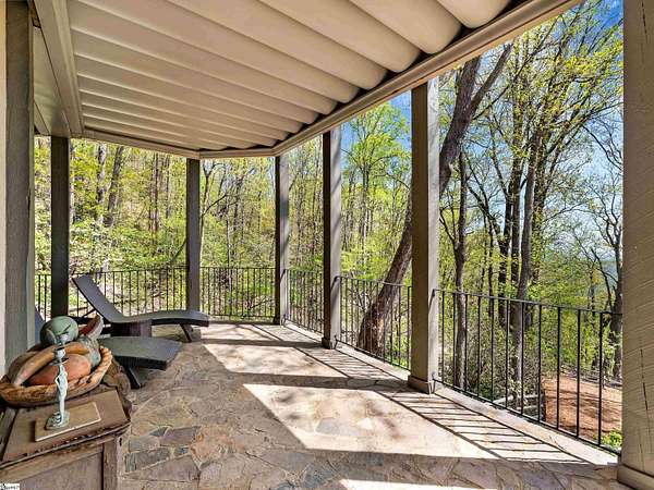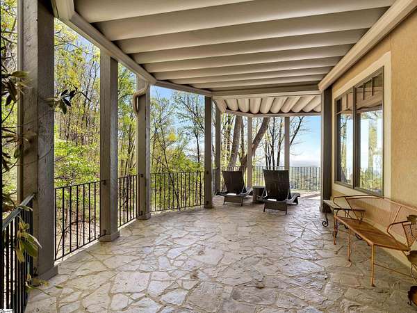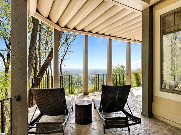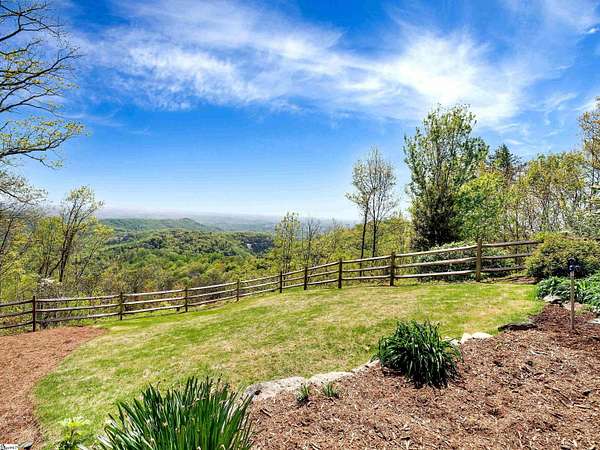 Come home to The Cliffs at Glassy, The Cliffs’ original gated golf & wellness community atop Glassy Mountain in Landrum, SC. Perched in serene seclusion at over 2,000 feet of elevation, this stunning mountain sanctuary commands breathtaking views of the gently rolling Blue Ridge Mountains. Tucked within a peaceful, elevated landscape, the home effortlessly blends timeless elegance with modern comfort. From the moment you arrive, the striking curb appeal sets the tone. A gentle creek meanders alongside the property, adding a soothing natural soundtrack & enhances the serene, woodland atmosphere. The exterior has been recently refreshed with newly stained beams that pair beautifully with the stone accents. Step through the inviting front entrance into a bright, spacious foyer that flows into a light filled great room centered around a striking stone fireplace with soaring beamed ceilings & expansive windows. Just off the foyer, a cozy library provides a peaceful hideaway for enjoying a book or catching up on the day’s events. The main level is thoughtfully crafted for both daily living & effortless entertaining with a kitchen that flows seamlessly into the hearth room that’s anchored by a charming brick & stone double-sided fireplace. Adjacent to it, the wide dining area—crowned with a soaring cathedral ceiling–-also captures the long range views. The kitchen’s unique cork flooring ensures comfort, while premium features include a Sub-Zero refrigerator, newly installed Bosch oven, 5-burner cooktop, built-in bar nook, & abundant custom cabinetry that balances style & function. For peaceful mornings or laid-back evenings, retreat to the all-seasons porch off the hearth room. This outdoor haven connects to an open-air deck, a separate grilling area, & stairs leading down to the lower-level covered deck—offering multiple spaces to gather or entertain. The primary suite is a private sanctuary, tucked away on its own side of the home & designed to take advantage of the sweeping views. An expansive walk-in closet & a luxurious en-suite bath—complete with a large shower & private water closet—make daily routines feel indulgent. The main level is completed with a stylish powder room, private home office, & spacious laundry room.. The lower level mirrors the home’s thoughtful design & inviting feel—ideal for guests or extended family. A spacious living area with a wet bar opens to a covered deck & leads to the fenced backyard and lush gardens. Stone footpaths meander through fern beds and tiered planting areas, enhancing the home's natural beauty. This level also features three generously sized guest bedrooms, a flex room perfect for a media room or man cave, and a large unfinished storage space providing ample space for seasonal items. Backing up to 140 acres of protected Nature Conservancy land, this home guarantees enduring privacy, beauty, and tranquility but also affords convenience with its location just minutes from the Glassy east gate. Designed to celebrate the changing seasons and embrace its wooded surroundings, this home is a sanctuary of natural beauty—complete with the soothing sounds of three nearby waterfalls and unforgettable views of spring greens, fiery autumn foliage, and stunning mountain vistas. A Club membership at The Cliffs is available for purchase with this property giving you access to all seven communities.