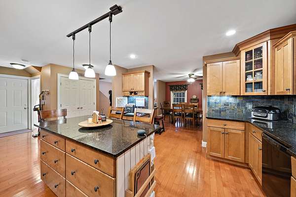 Gorgeous, impeccably maintained, and solidly built, this exceptional home blends quality, comfort, and privacy in a standout setting. Set on over two wooded acres, it offers more than 2,500 sq. ft. of above-ground living space, plus a professionally finished walk-out lower level that broadens the lifestyle possibilities. Inside are 4 spacious bedrooms, 4 baths, and an open-concept first floor ideal for everyday living and entertaining. The sunken living room with access to a screened porch creates a warm, inviting atmosphere, while updates--including a new tile backsplash and refreshed baths--add modern appeal. The walkout lower level is a major highlight: bright and newly finished with a 3/4 bath and kitchenette, it's ideal for an in-law setup, boomerang young adult, long-term guests, or multi-generational living, offering independence and direct outdoor access. Outside, enjoy a wraparound mahogany farmer's porch with a view to a seasonal brook down below, an oversized two-car garage, asphalt and paver driveway, large shed, and fenced pet area. A generator setup powers most major systems for year-round peace of mind. Though wonderfully private, the home is less than a mile from Route 101, making it a commuter's dream. With its setting, updates, versatility, and thoughtful design, this home truly has it all. Day before notice for showings please. Looking to close first week of February ideally.