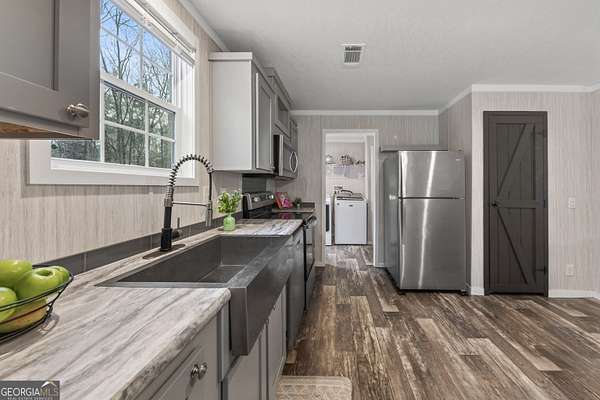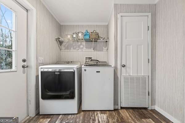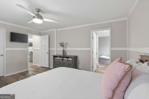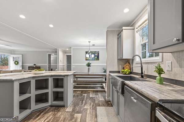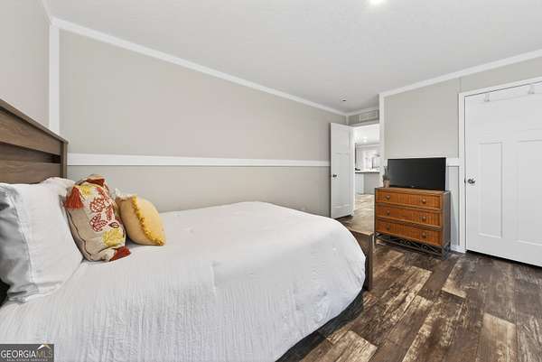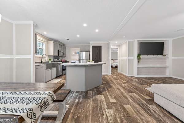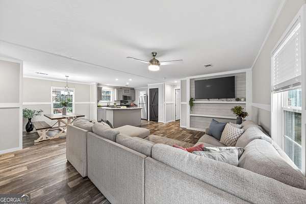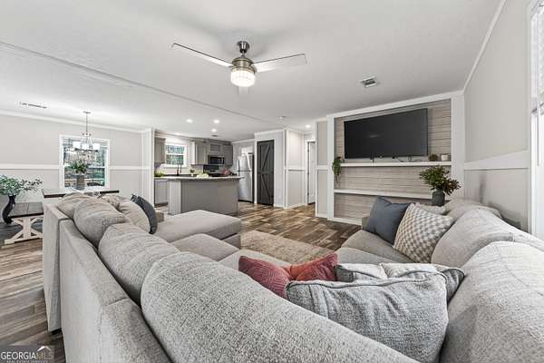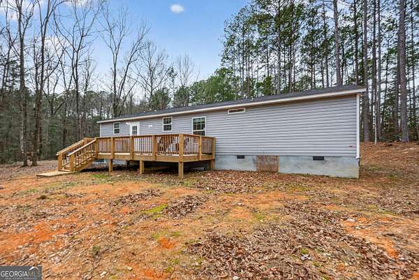 Welcome to this charming 2024-built manufactured home nestled on 2.8 beautiful acres in Carlton, GA. Step inside and you're greeted by a bright and inviting open-concept living and kitchen area. The spacious living room offers plenty of room for seating and features built-in shelving perfectly designed for your TV and decor. The living room flows seamlessly into the modern kitchen, complete with a center island offering additional storage, stainless steel appliances, and abundant cabinetry. You'll love the walk-in pantry tucked behind a stylish barn-style door - it's spacious and functional! Adjacent to the kitchen is the dining area, filled with natural light from the nearby windows and roomy enough for a full-sized dining table. Off the living and dining space, two nicely sized secondary bedrooms share a full hallway bathroom, each with generous closet space. On the opposite side of the home, you'll find the private primary suite, featuring a large bedroom and an impressive en-suite bathroom with double vanities, a large stand-up shower, and a relaxing soaking tub. Conveniently located off the kitchen, the laundry room provides access to the back deck. The spacious back deck is ideal for grilling, entertaining, or simply taking in the peaceful surroundings. Outdoors is where this property truly shines! With 2.8 acres, a creek running through the property, a bridge crossing the creek, and even two treehouses, there's room to explore and enjoy the natural beauty all around. Whether you're looking for recreation, quiet country living, or room to expand - the possibilities are endless! Don't miss this unique opportunity to own a slice of Madison County countryside with modern comfort and plenty of charm!