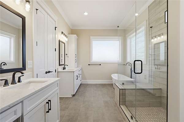 - Bath In Primary Bedroom, Cable Tv, Cathedral Ceilings, Ceiling Fans, Dual Sinks, Fireplace, Garden Tub Roman Tub, High Ceilings, Jack And Jill Bath, Main Level Primary, Pull Down Attic Stairs, Quartz Counters, Separate Shower, Smooth Ceilings, Walk In Closets, Walk In Shower