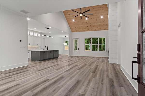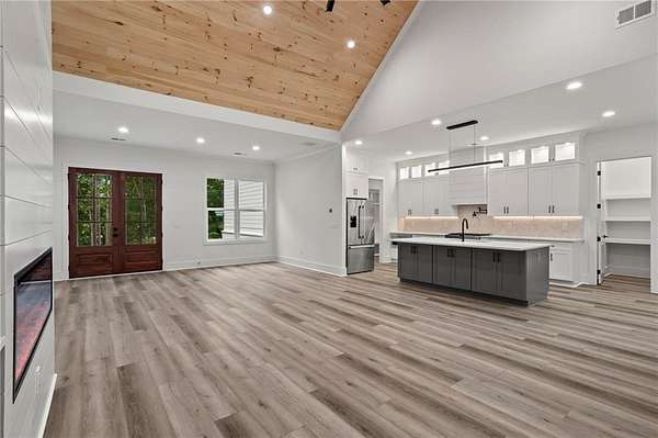 This thoughtfully crafted 4-bedroom, 3.5-bath residence showcases a seamless blend of luxury, comfort, and functionality. A charming farm-style fence, long concrete driveway, and both front and back stamped concrete porches create a welcoming exterior. Step inside to discover an open-concept layout flooded with natural light and highlighted by soaring 18-ft vaulted tongue and groove ceilings in the main living area, and stained tongue and groove tray ceilings in the primary suite.