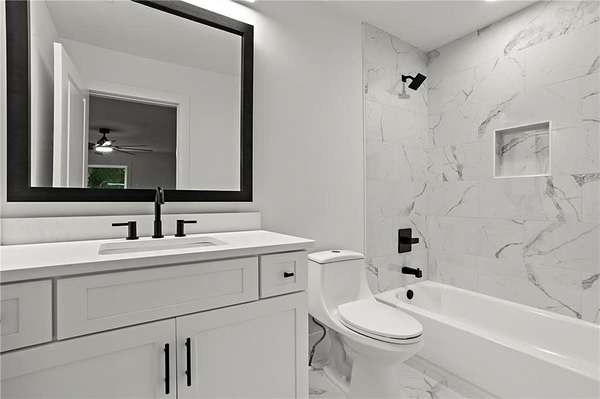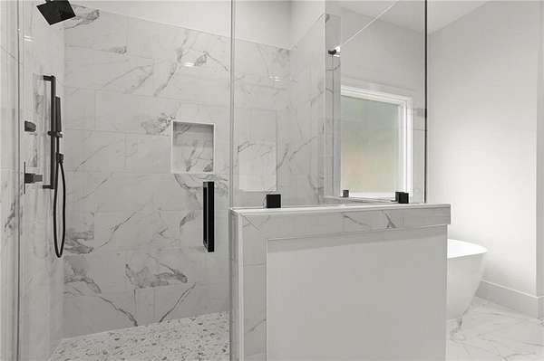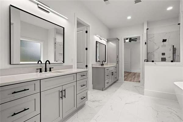 The main-level owner's suite is a luxurious retreat, complete with her and hers vanities, soaking tub, oversized tiled shower, custom California walk-in closet, and a built-in dressing mirror. Two additional bedrooms on the main share a bathroom, while a private upstairs in-law suite includes a full bath, walk-in closet, smart thermostat, and walk-in attic access for extra storage.