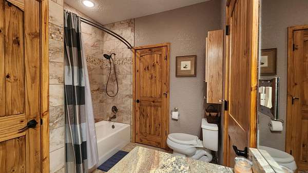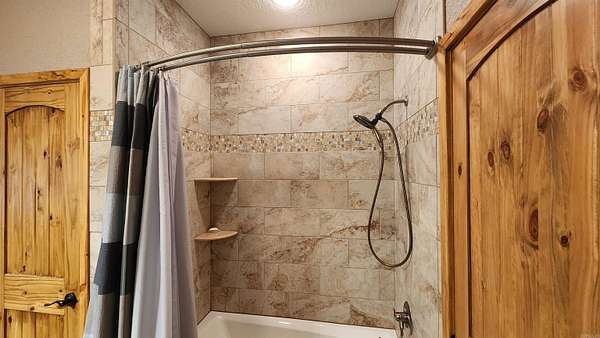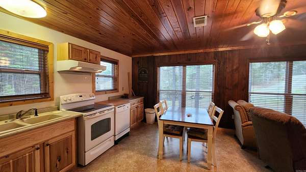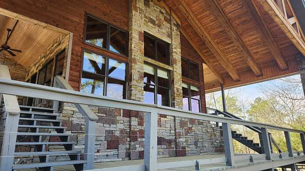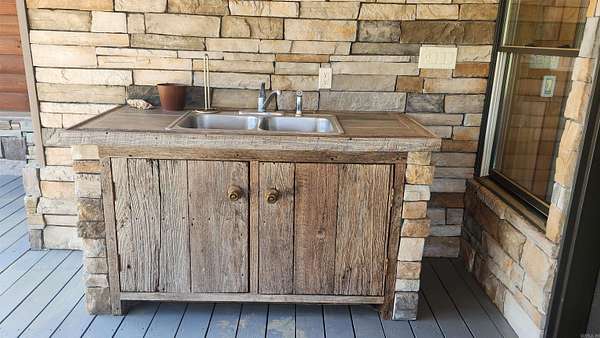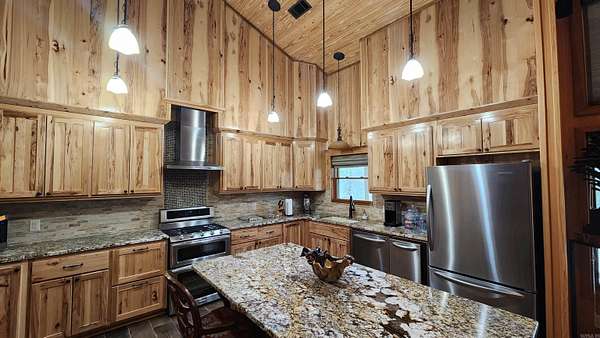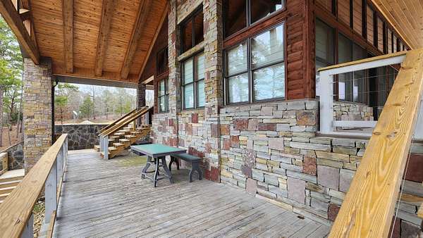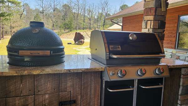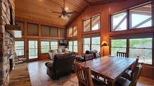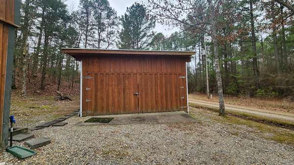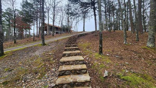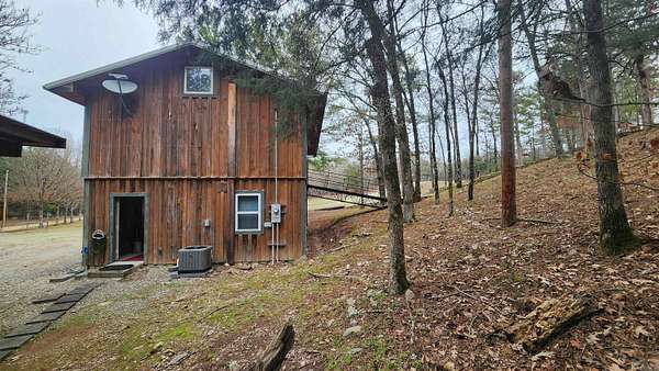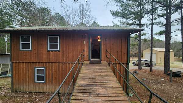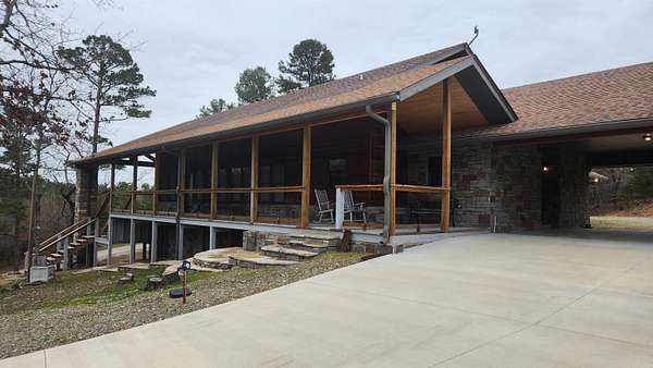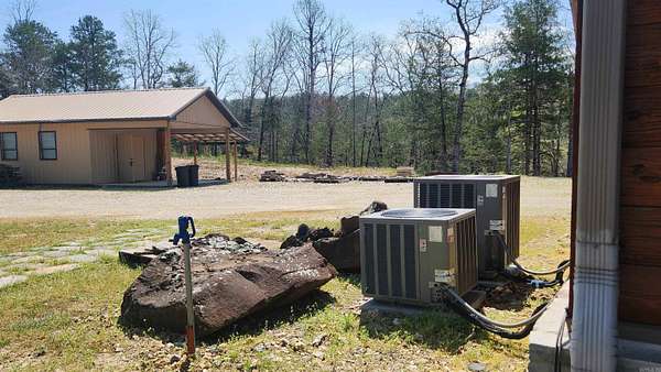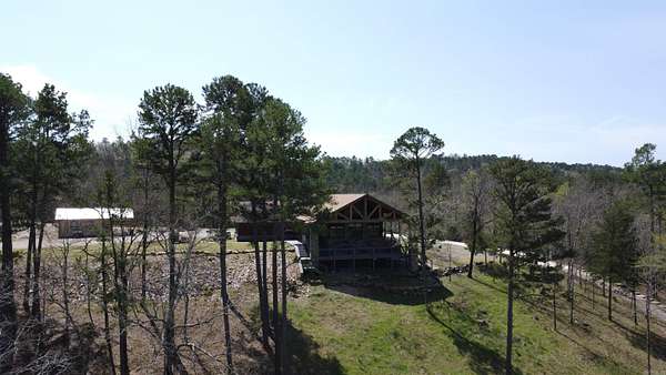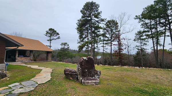 Custom built home sitting on 12.61 acres with an amazing mountain view. Less than a mile to Lake Ouachita. Built in 2015. 2540 sq, 2 bed 2 bath with an office. Attached 2 car carport with concrete. Bathroom floors are heated. Shower in primary suite is a 5' tiled walk-in shower. Primary bath has 2 separate vanities. Home has 3 water heaters to keep everyone supplied with hot water. Vaulted ceilings, granite counter tops, hickory cabinets throughout. Cypress walls in living area. Pella windows in every room. 36" interior doors. Mostly furnished. Stainless Steel KitchenAid appliances. Rock fireplaces (gas logs) in living area and sunroom. Large Sunroom has an amazing view, heated floors and vaulted ceiling. Lots of out door space with wrap around wooden deck (one part is 70x10 and other part is 40x10). Outdoor kitchen has a built-in Big Green Egg, gas grill, sink with cold/hot water. Storm shelter under home. Guest house is fully furnished (672 sq ft) has 2 bedrooms and 1 bath with kitchen. 19x15 "tool shed" with 12 ft porch, 40x16 "boat shed", 32x21 "man cave", 42x20 "barn", well, septic, 24kw Generac generator, 3 acre pine thicket, and stocked pond. The rock work is phenomenal.