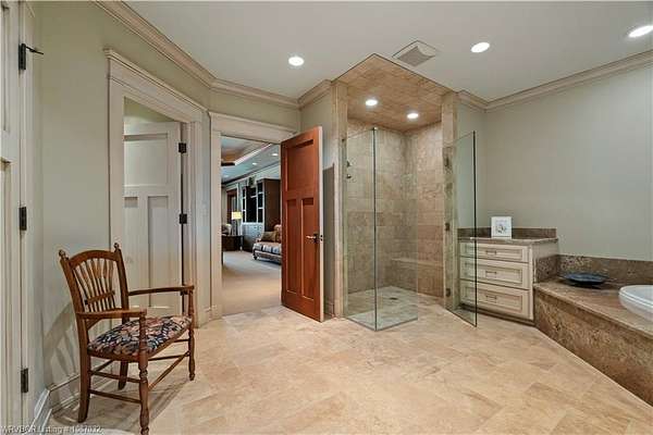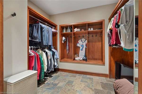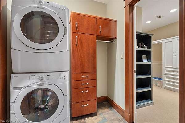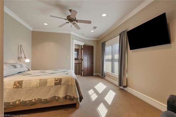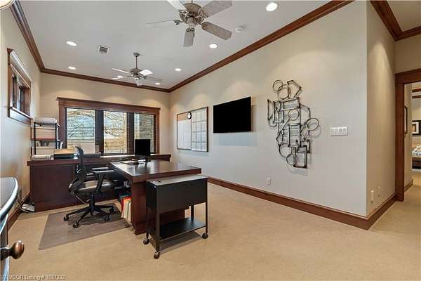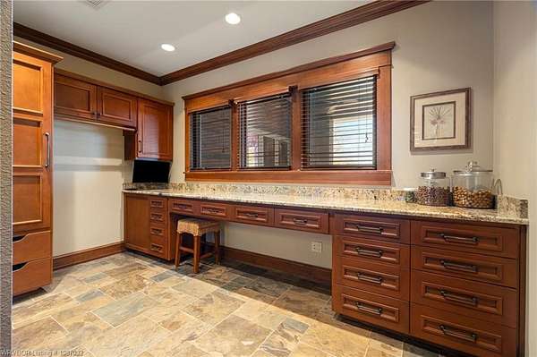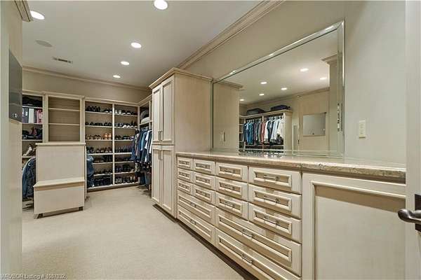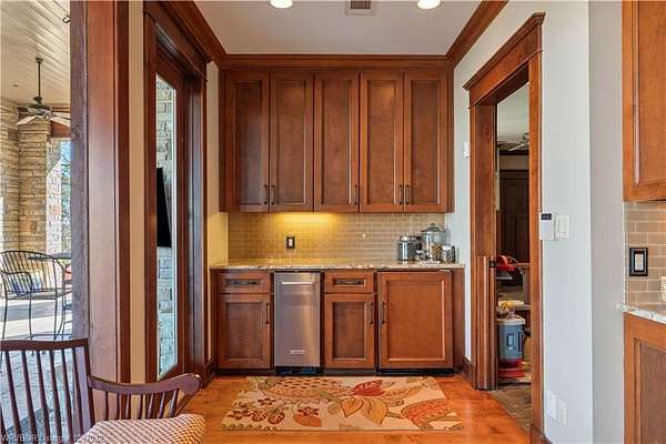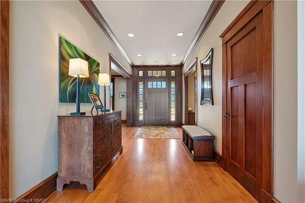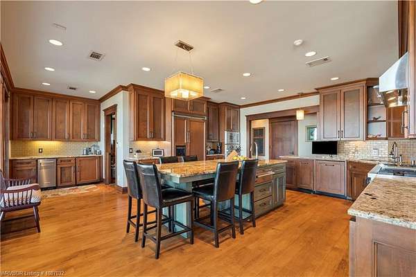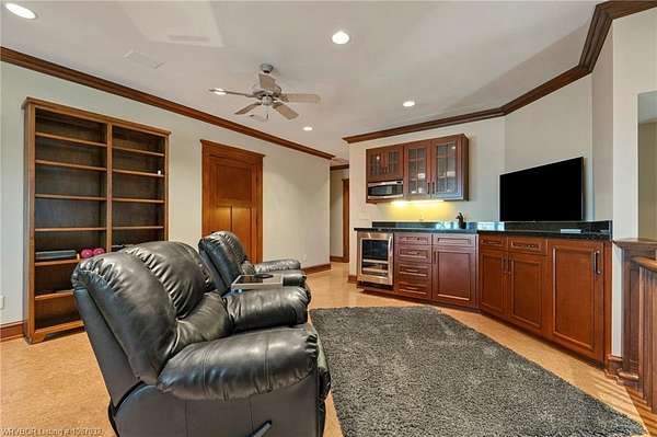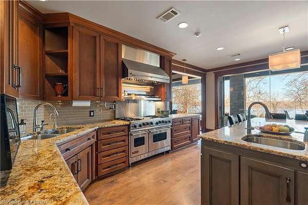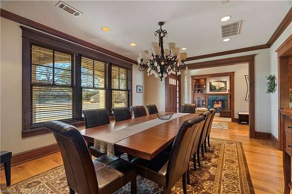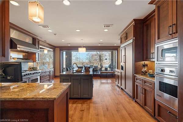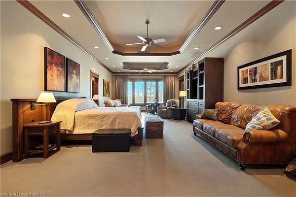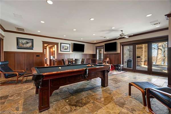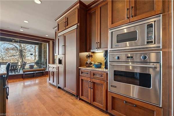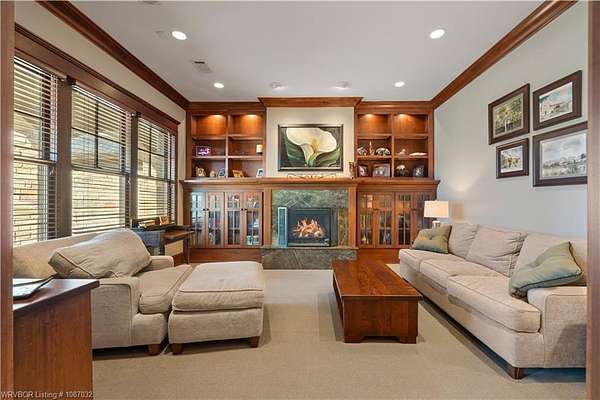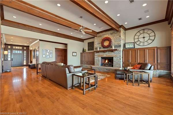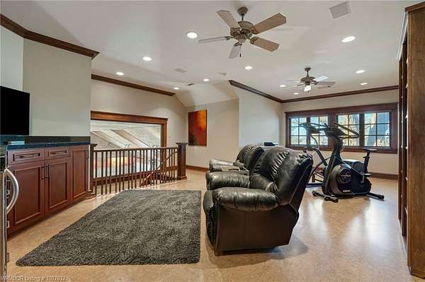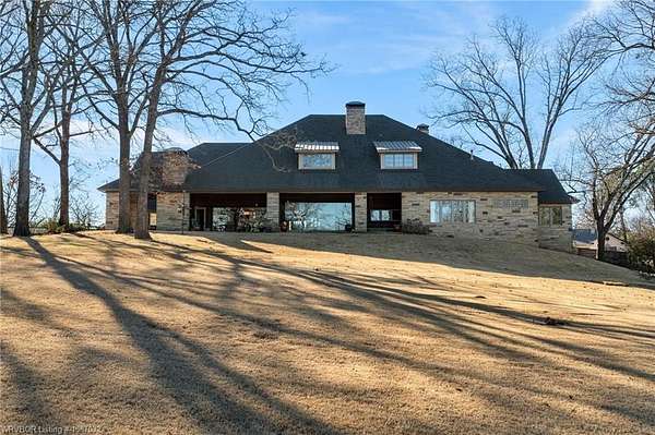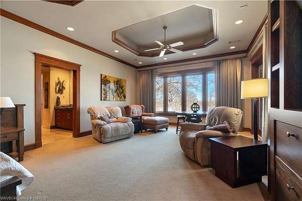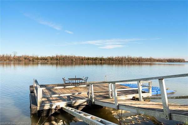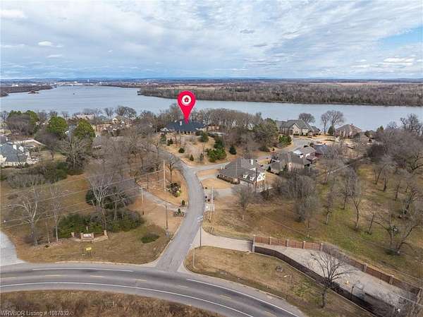 Custom riverfront Craftsman estate on ~5 acres directly on the Arkansas River (Pool 13). Private dock, swimming pool, covered outdoor living area with fireplace, and a wired hot tub area create a true resort setting minutes from town, hospitals, and shopping. Chef's kitchen with Viking appliances, double ovens, warming drawer, pot filler, walk-in pantry, ice maker, and island seating. Main-level primary suite with river views, porch access, separate baths (sauna & whirlpool), and walk-in closets. Library, office with river view, butler's pantry, and formal dining. Upstairs offers 3 bedrooms (2 en suite), a laundry, a craft/utility room, a game/workout area with a kitchenette, and walk-in attic storage. Climate-controlled 3-car garage, separate drive, central vacuum, and geothermal HVAC. Rare in-town acreage waterfront property.
