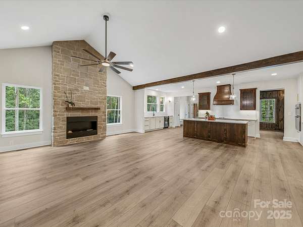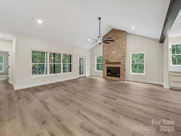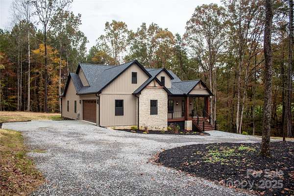 Tranquil, country setting with a creek! New options and reduced price, adjoining lot of .89 acres still available for additional purchase, but now being offered separately. This new construction home boasts unrestricted 2.34 acres with a large creek, 3 bedrooms, 2 full bathrooms, an office, 2 car garage, designated dining room, designated laundry room, a walk-in crawl space for ample storage possibilities, and a large screened porch with a cozy stained, tongue and groove ceiling. The spacious, open concept kitchen features leathered granite countertops, custom-built cabinets and a sink overlooking the creek. A stunning rock fireplace in the vaulted living room adds a cozy ambiance, perfect for this wooded retreat. The primary bedroom features a vaulted ceiling, walk-in closet, double vanity, private toilet closet, and a wet room with a tile shower and freestanding bathtub. Come see the many beautiful custom touches this home offers! Located 8min from Union Grove.
