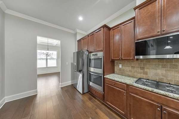 - Dishwasher, Disposal, Double Oven, Gas Cooktop, Gas Oven, Gas Range, Microwave, Range Hood, Refrigerator