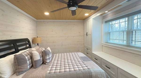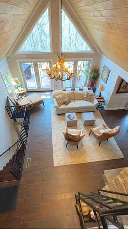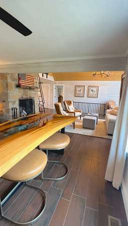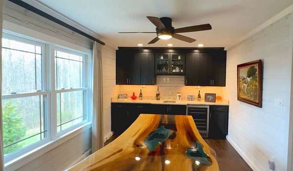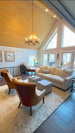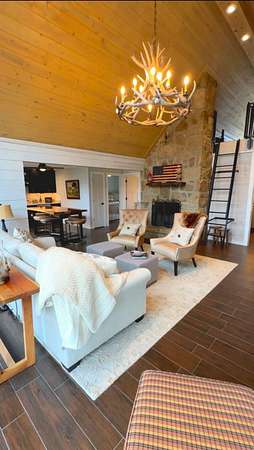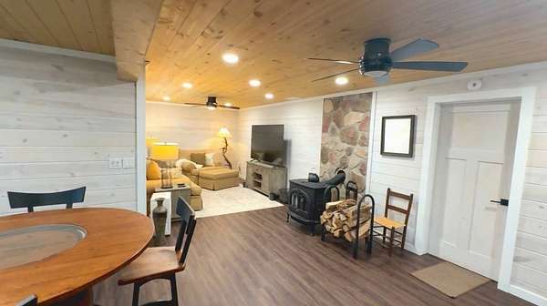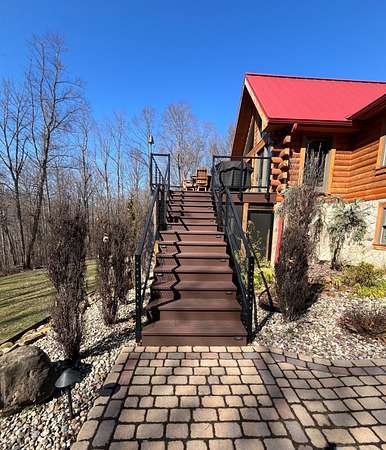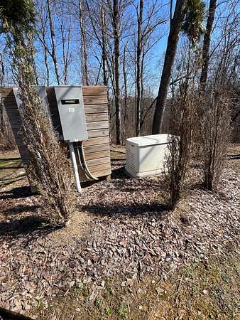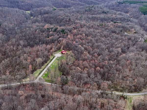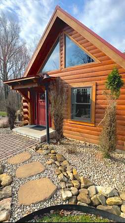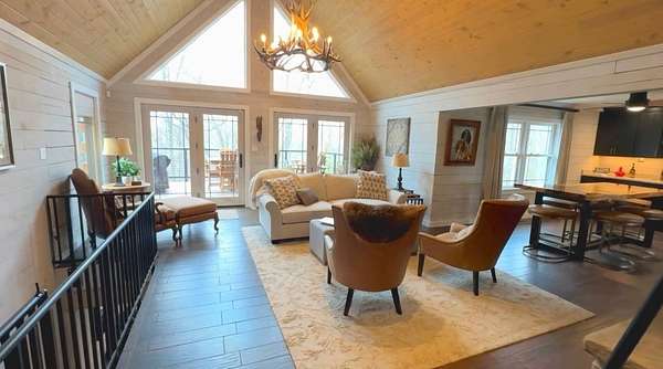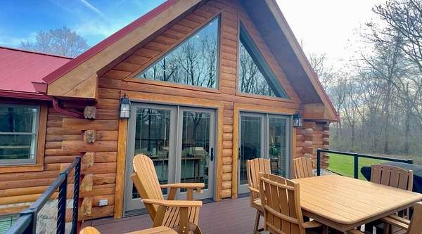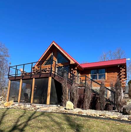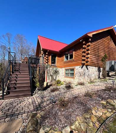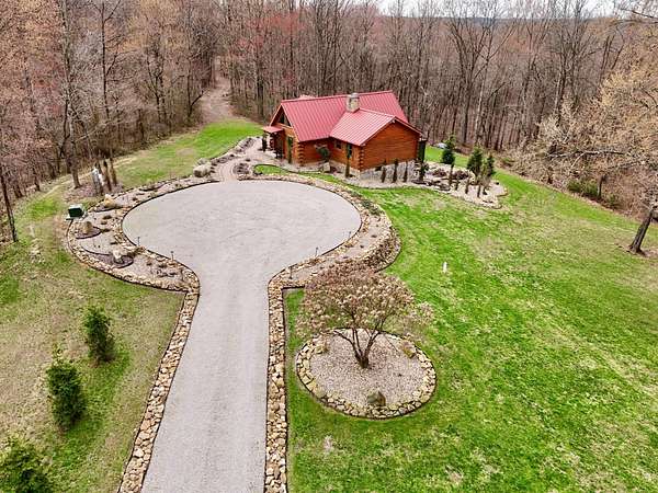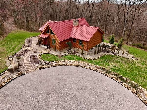 The log cabin's driveway is beautifully landscaped and maintenance-free, leading to a private sanctuary. Characterized by robust and organic aesthetics, the exterior is complemented by 25 acres of grounds that are expertly curated to balance the natural forest with manicured utility. Clean pathways created with pavers and stones surround the home, while thoughtful outdoor lighting creates an enchanting ambiance at night. The property boasts multiple outdoor areas, including a screened-in covered patio with a fire pit and durable outdoor furniture. An expansive upper deck offers views of the main fountain, exemplifying rustic elegance in harmony with nature. Upon entering this residence, you're greeted by a spacious open-concept layout. The kitchen and dining area feature extensive cabinetry, granite countertops, and nice ceramic tile flooring. The living room is highlighted by a vaulted ceiling and a stunning stone fireplace, perfect for snuggling up on brisk evenings. The floor-to-ceiling double doors and windows allow for plenty of natural light to pour in. The loft area overlooking the living room makes for an excellent play space for children. A wet bar located near the living room offers an ideal entertainment space, complete with a wine cooler, sink, and plenty of cabinet space. The spacious owner's suite on the main level boasts generous natural light, a walk-in closet, and a luxurious bathroom. An additional bedroom and bathroom are situated on the main level. The basement features a family room with a wood-burner stone fireplace, a third bedroom with ample built-in storage, and a utility area housing the furnace and tankless water heater. Additional 52.6 acres m/l available for sale for $215,000.