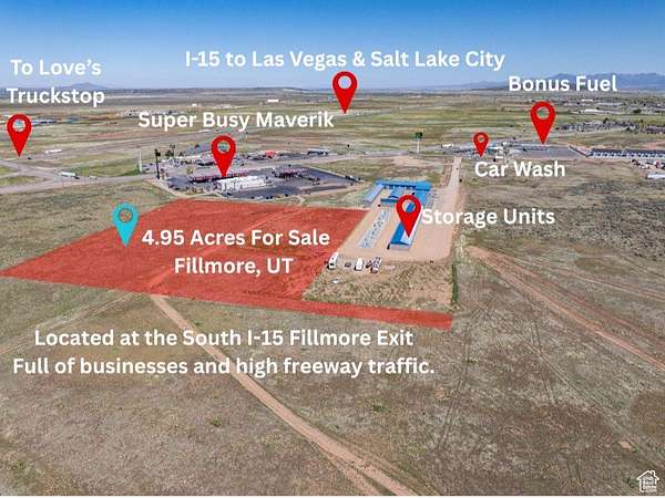 Est $2,601/moNearly 5 acres of $ Prime Investment $ ground located between the Fillmore Maverik and storage units. This large parcel is zoned Highway Commercial, is in a beautiful location at the base of the mountains and visible from I-15 and Main Street. Surrounded by many growing businesses. Great location for future development, with all utilities available to connect to. The corners have been flagged for visual purposes, but the property has not been surveyed on all corners. Acreage, maps and taxes are estimates, buyer to verify all information. Access this property with a 53' deeded access from 725 West. From 900 South, turn south in front of Fillmore Super Wash, follow gravel road to end of fencing, turn right and follow fencing to the west.